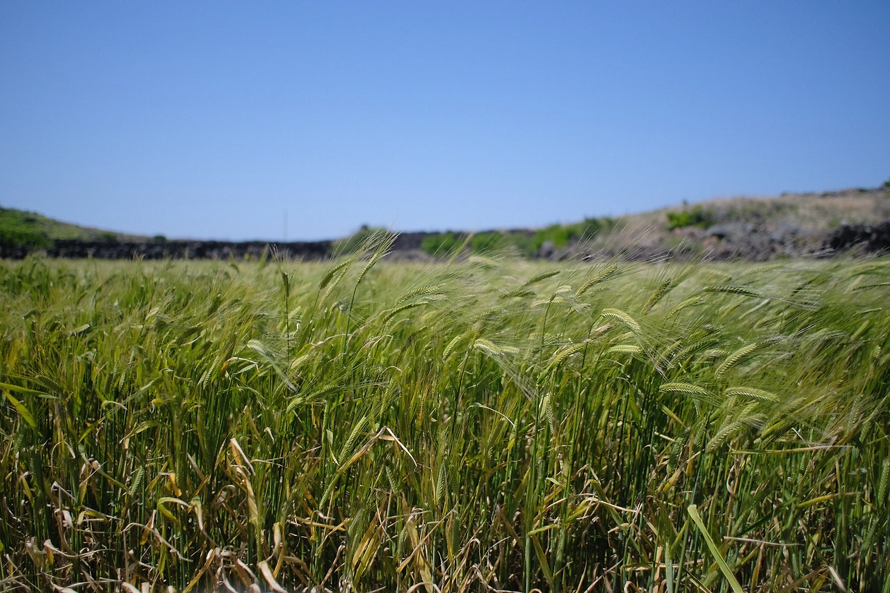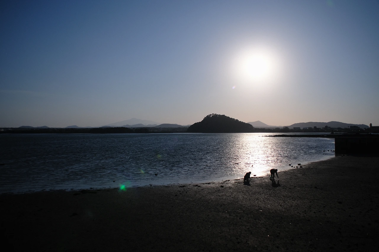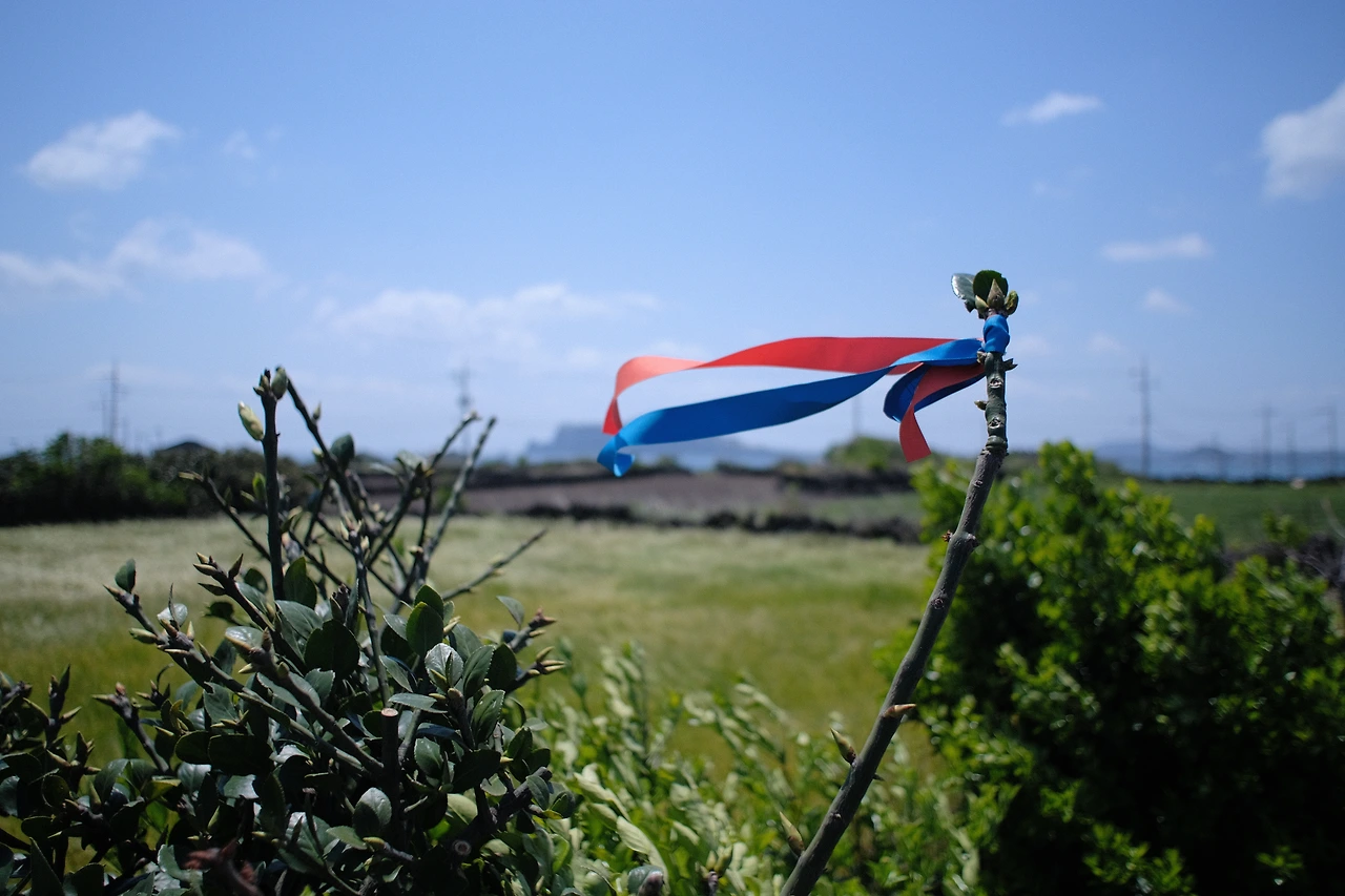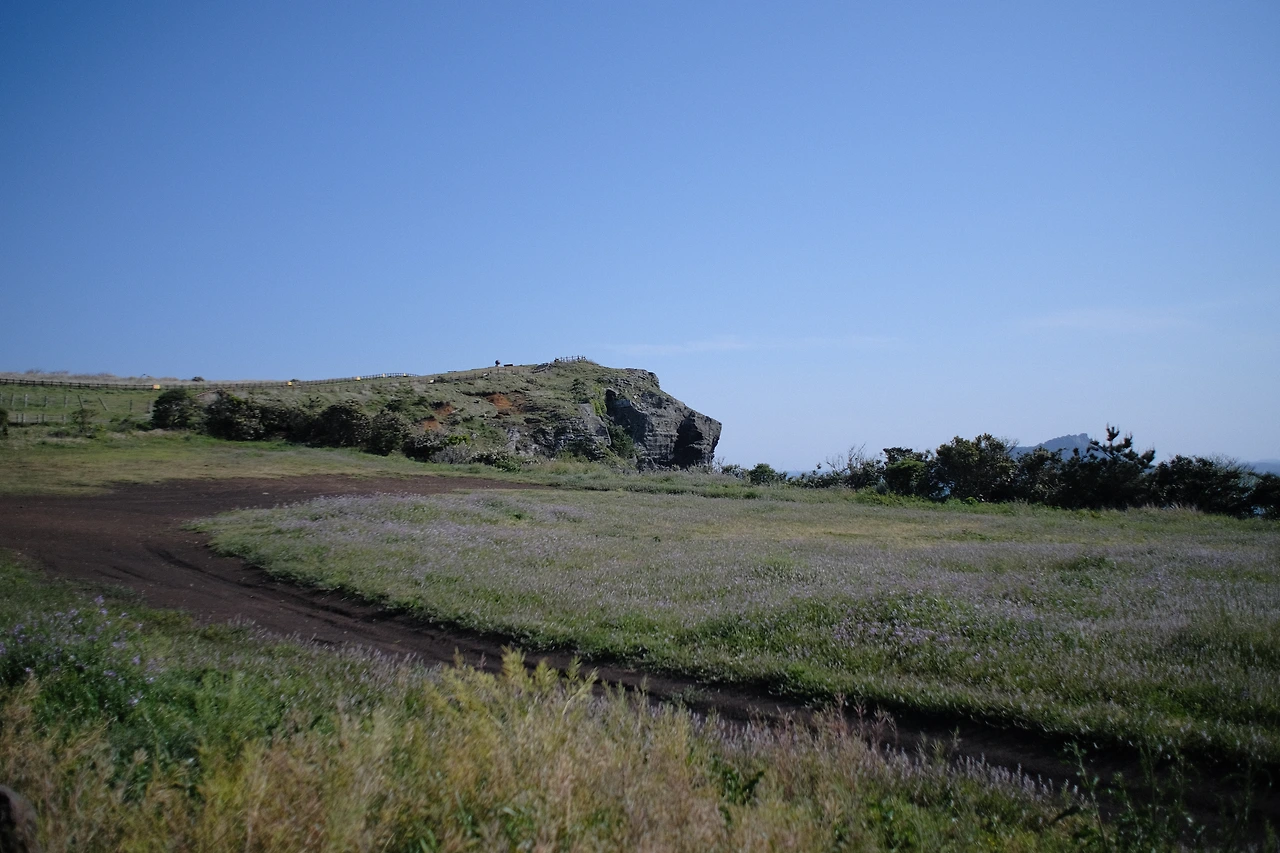 마을을 지나 밭과 돌담 길을 걷다 보면 탁 트인 섬의 저편에 성산일출봉과 지미봉이 보였다. 오늘도 하늘이 매우 푸르고 쾌청하다. 시원한 풍경에 기분이 좋아진다.