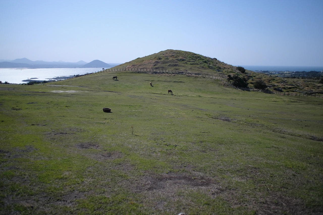 등대공원에서 내려와 다시 말들을 만났다. 5년 전에는 소도 적당히 보였는데 이번 우도 올레는 소보다 말이 많다. 등대공원을 내려온 시점에서 우도봉(소머리 오름)으로 올라갈 수 있다. 올레길은 우도등대를 내려와 천진항으로 가기 때문에 우도봉을 가려면 지도 앱을 이용해 둘러보고 내려오는 것이 좋다. 우리는 당시 몰랐기 때문에 우도봉은 가보지 못했다. 우도는 소가 누워 머리를 든 형상을 한 섬인데 오름 남쪽에 위치한 정상부를 소의 머리라고 하여 우두봉 또는 소머리, 쇠머리, 섬머리 오름, 도부봉 등의 이름으로 불린다.