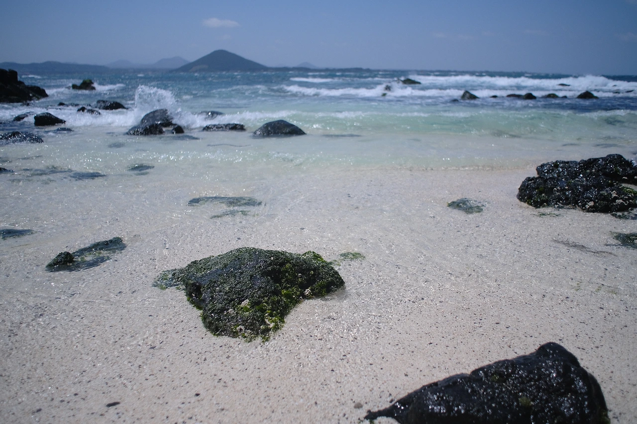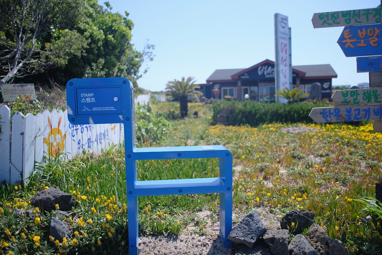 부드러워 보이는 하얀 백사장과 초록빛 바다의 하고수동해수욕장. 조그만 의자에 앉아 해수욕장을 배경으로 사진도 찍고 부드러운 백사장도 밟아본다. 해변 끝에 다다르면 범선국수가 보이고 중간 스탬프 간세가 나온다. 스탬프를 찍고 시계를 보니 14:35분이다.