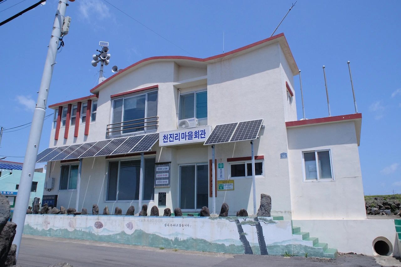 섬이라 그런지 바람이 매우 강하다. 마을 쪽으로 조금 들어가자 천진리 마을회관이 나왔다. 회관을 지나 좌측으로 돌면서 섬을 시계방향으로 돌겠구나 하는 느낌이 든다. 우도의 남쪽이다 보니 제주도로 치면 서귀포에서 시계방향으로 올라가는 느낌일 것이다.