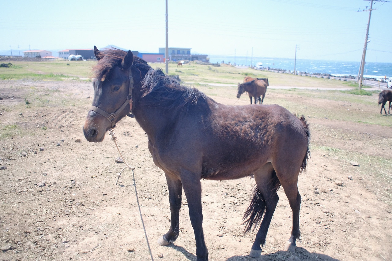 하우목동항의 대합실만 잠깐 들어갔다가 나와 올레길을 이어간다. 풀밭을 걷다 보면 말들이 많다.