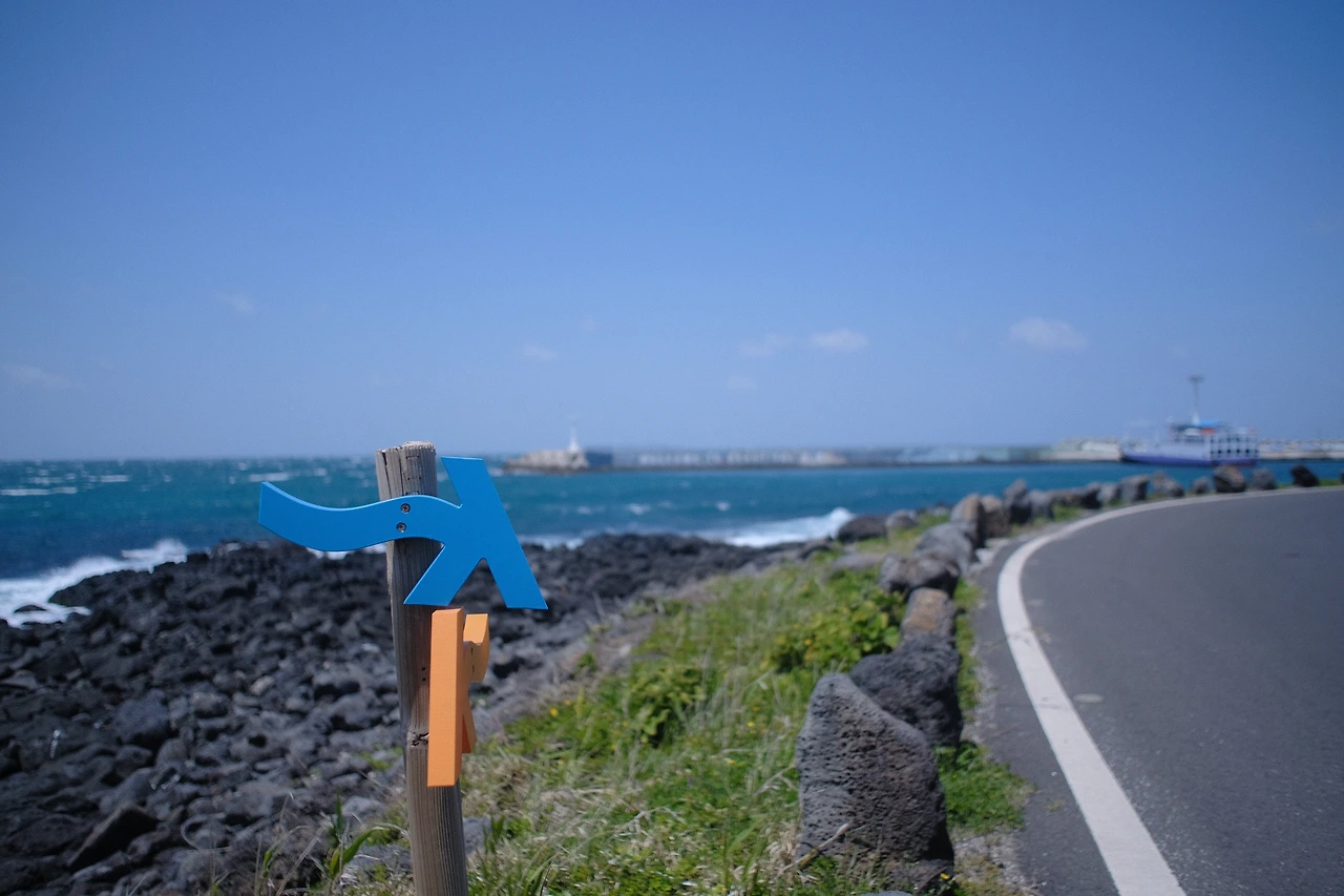 들판 저편의 소가 조금씩 보이기 시작했다. 5년 전에도 이 들판에서 소가 풀을 뜯어 먹고 있었다. 들판을 지나 천진길의 작은 마을을 지나면 다시 해안로가 나온다. 하우목동항의 방향을 알려주는 안내판과 올레의 이정표 방향을 바라보면 산호해수욕장이 보인다. 우도를 찾는 대부분의 관광객은 렌트 차량, 스쿠터, 미니 전기차를 타고 해안로를 많이 돌아다니기 때문에 올레꾼은 주의가 필요하다.