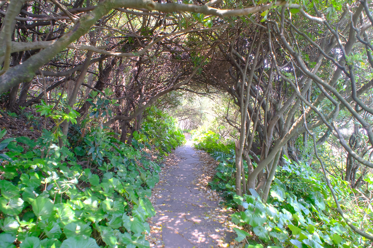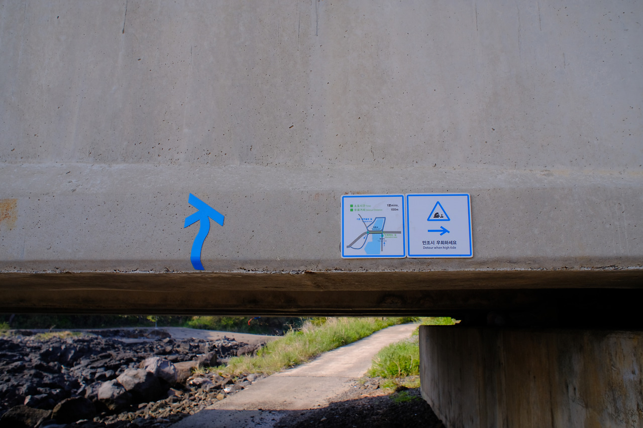 해안로를 걷다가 바닷가 쪽 샛길로 다시 빠진다. 돌길, 흙길, 숲길, 콘크리트길을 지나 태흥교가 나왔다. 만조 시 태흥교를 건너 우회하라는 알림판이 있는데 별 차이도 없어 보여 바로 태흥교 통해 건너간다.