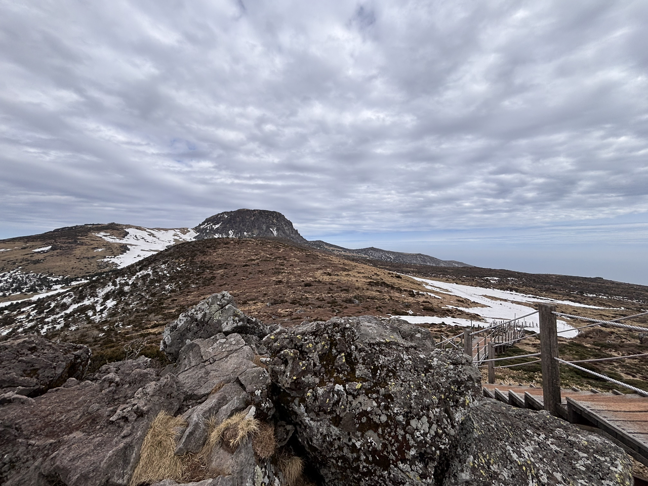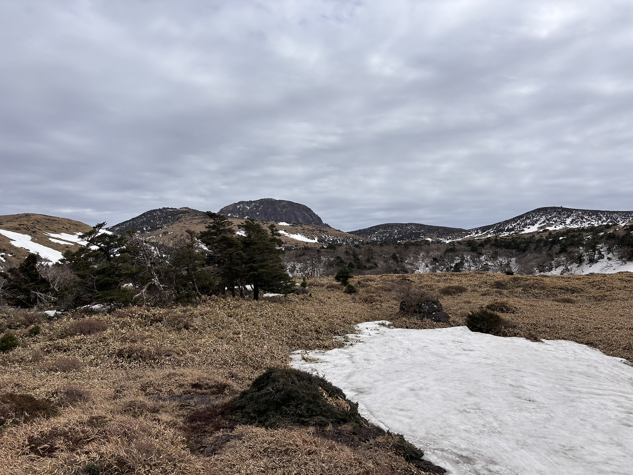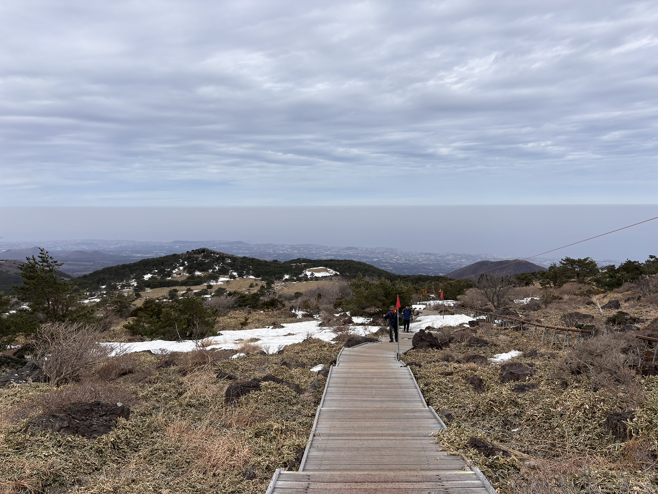 1시 9분, 나무데크길을 지나 만세동산 전망대에 도착했다. 비록 날씨는 흐렸지만, 그럼에도 풍경은 아름다웠다. 전망대에서는 삼형제오름, 노로오름, 바리메오름, 쳇망오름, 큰노꼬메, 족은노꼬메, 사제비동산이 한눈에 들어왔다. 그리고 해발 1,600m를 넘어서자 구름이 조금씩 걷히기 시작했고, 눈에 반사된 햇빛이 얼굴을 따갑게 했다. 선크림을 바르지 않은 것이 후회되는 순간이었다.