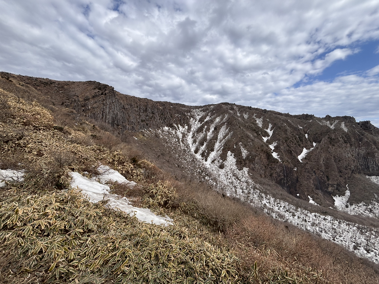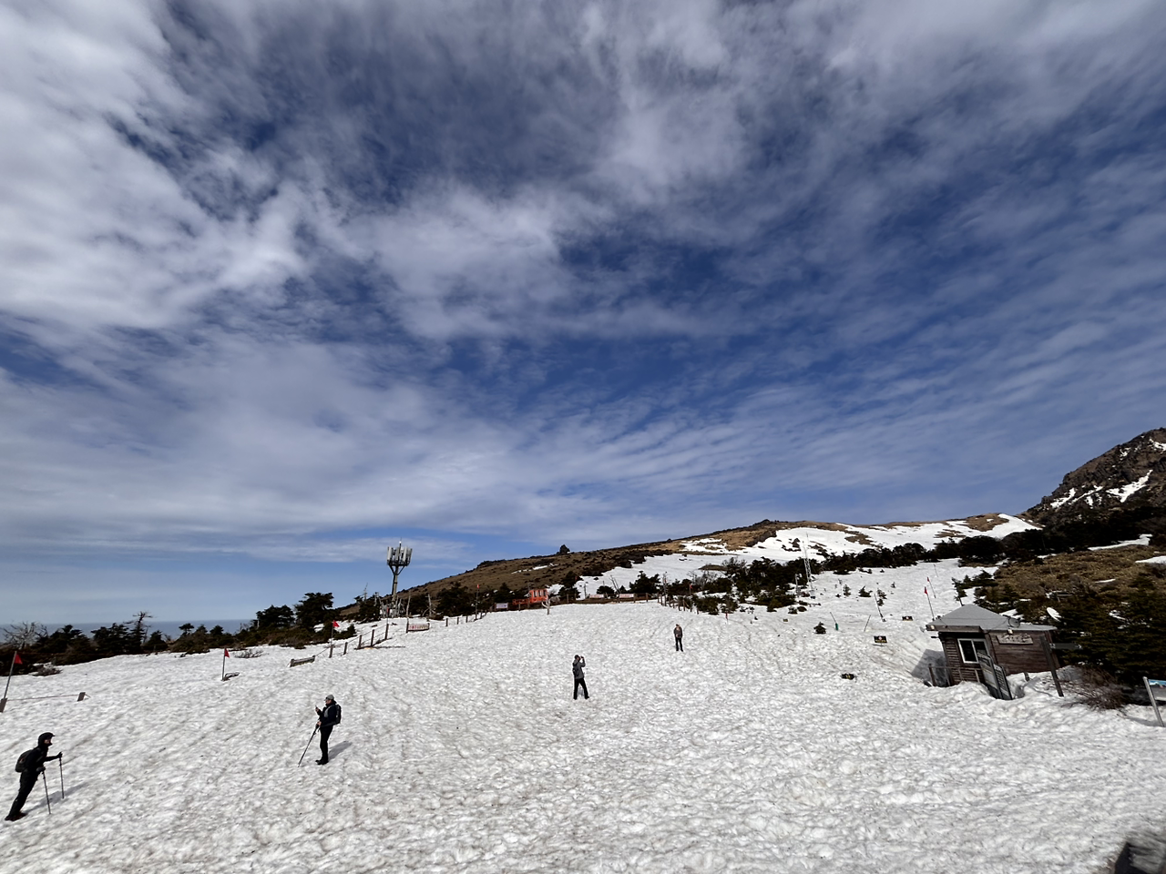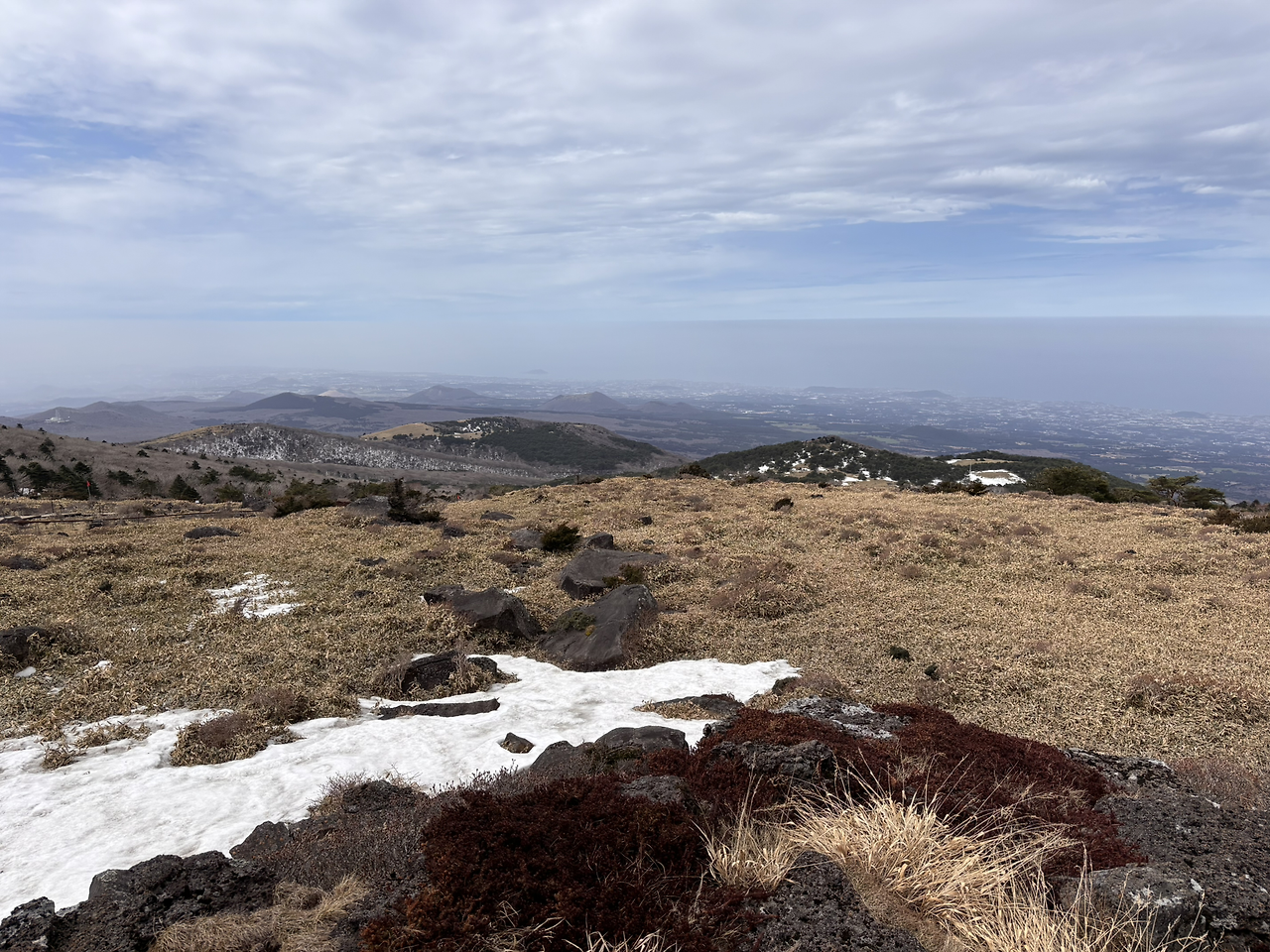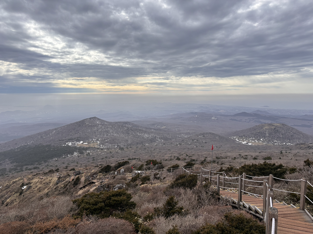 1시 9분, 나무데크길을 지나 만세동산 전망대에 도착했다. 비록 날씨는 흐렸지만, 그럼에도 풍경은 아름다웠다. 전망대에서는 삼형제오름, 노로오름, 바리메오름, 쳇망오름, 큰노꼬메, 족은노꼬메, 사제비동산이 한눈에 들어왔다. 그리고 해발 1,600m를 넘어서자 구름이 조금씩 걷히기 시작했고, 눈에 반사된 햇빛이 얼굴을 따갑게 했다. 선크림을 바르지 않은 것이 후회되는 순간이었다.