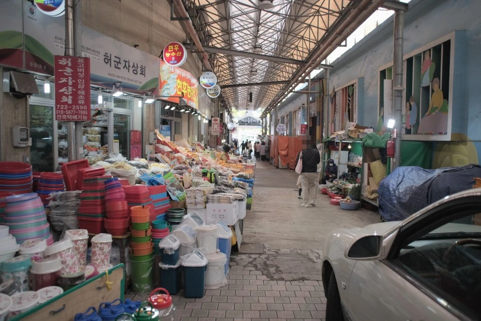 오현교를 지나 짧고 좁은 벽화거리를 통과하면 만나는 동문시장.