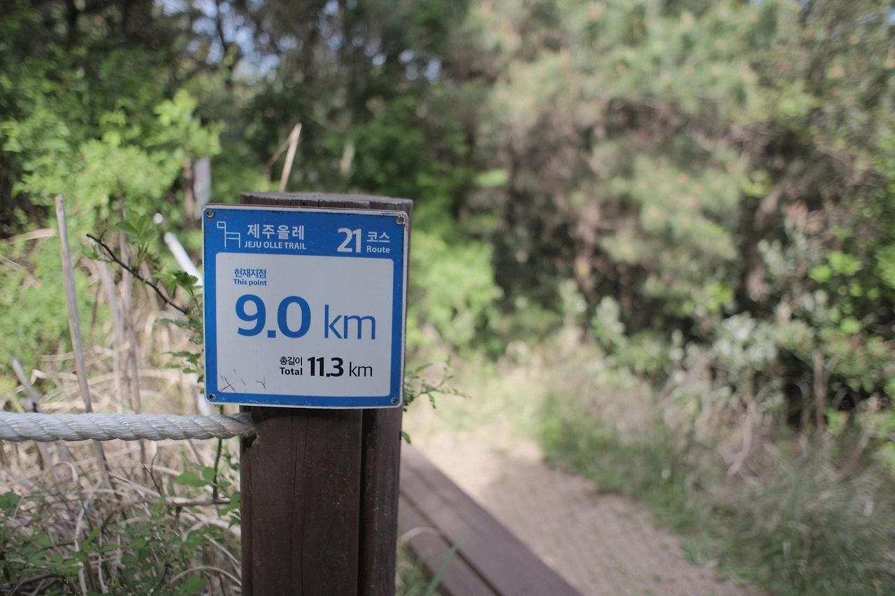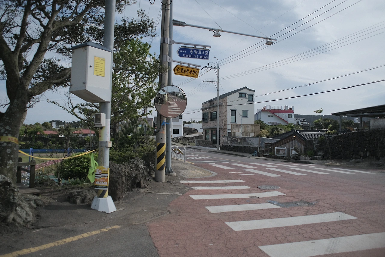 5년 전에도 물이 괴어있어 왼쪽 아스팔트 둔 턱으로 건너는 모습의 사진(초상권 문제로 올리지 못했다)이 있다. 아무리 봐도 비슷한 장소 같은데... 수시로 물이 고이는 곳일 수도 있겠다. 밭과 하늘을 보며 걷다 보니 어느덧 저 멀리 제주의 푸른 바다가 보인다. 해맞이 해안로로 빠져나와 조금만 걸으면 고 김대중 대통령 방문 맛집이라는 간판의 석다원과 중간 스탬프 간세가 나타난다.