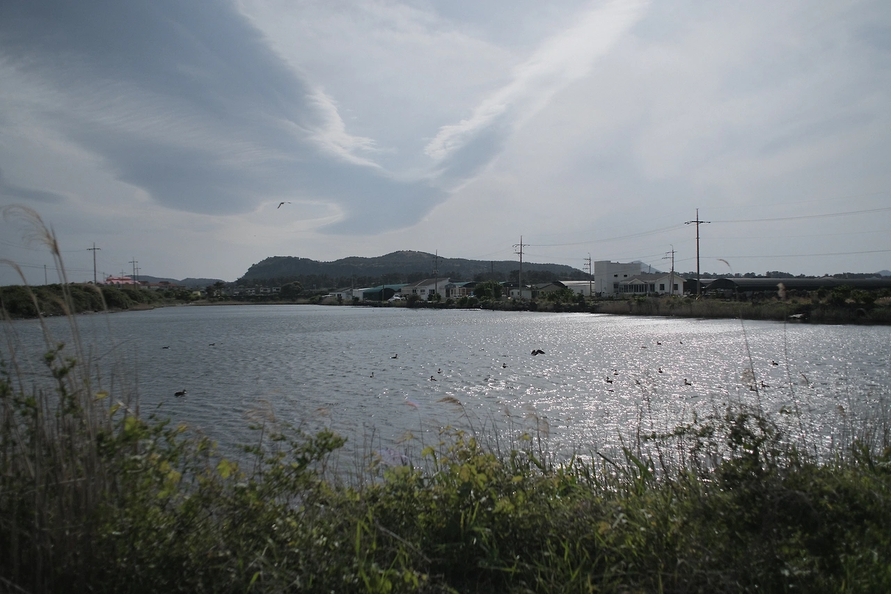 초반에 만났던 물과는 달리 한강 수준의 괸 물. 어떻게 지났는지 기억이 잘나지 않는다. 아마 물의 얕은 부분으로 잘 지나갔지 싶다. 그리고 시작되는 제주 섬 땅의 끝, 땅의 꼬리라는 뜻의 지미(地尾)봉 오름이 시작된다.
