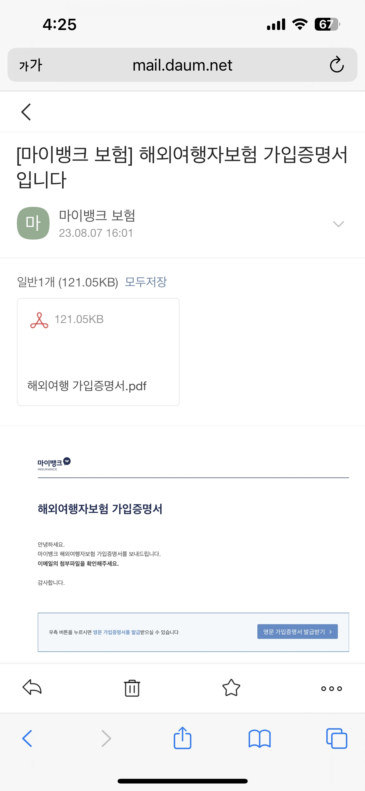 여행 커뮤니티 정보를 뒤져서 마이뱅크 여행자 보험을 들게 되었다. 2만 원 정도밖에 안 하는 저렴한 보험이라 최소한의 안전장치로 가입을 해놨다.
