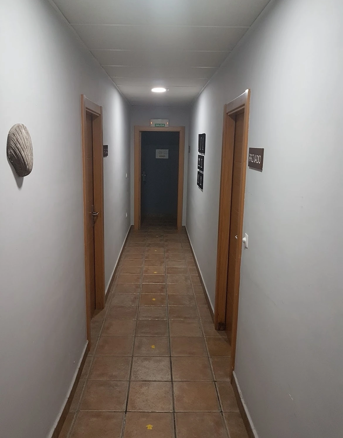 지하 계단으로 내려가면 식당과 빨래방이 왼쪽에 있었고 오른쪽으로는 긴 복도식 알베르게 숙소가 나타났다. 딱 알아보기 쉽게 조개 모양과 화살표가 길을 안내했다.