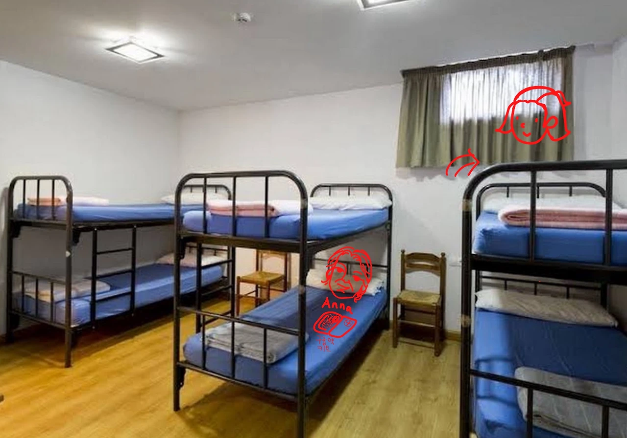 안나는 육인실 방 안에 가운데 1층 자리에 있었다.