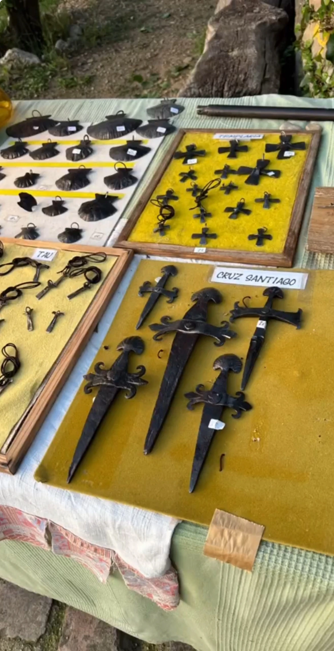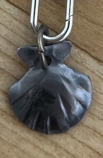 순례자 표식의 조개와 호리병 지팡이 기념품을 직접 망치질로 만든 기념품이 있다.