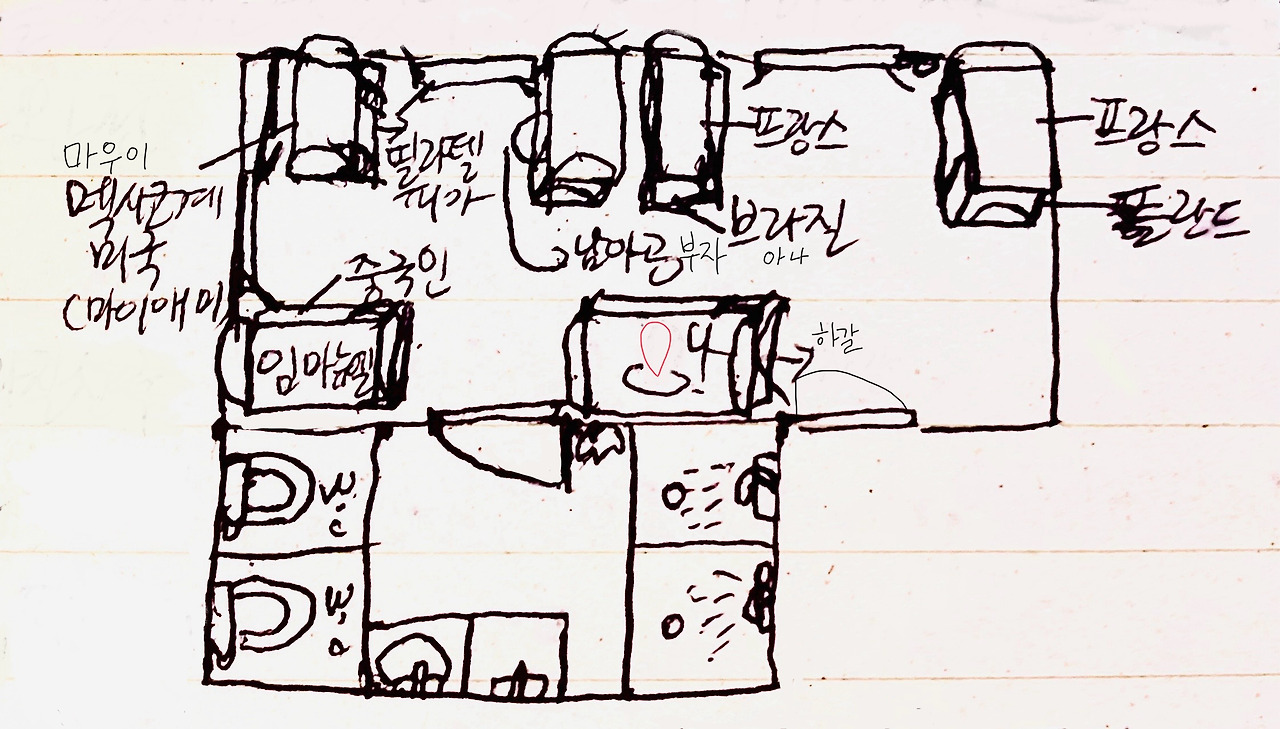 나: 한국인 하갈:이스라엘 /아나: 브라질 2층 프랑스 젊은 남자/ 1층 폴란드 2층 프랑스 아저씨/1층 중국인여자 2층 임마누엘: 프랑스/마우이(가명):멕시코계 미국인(마이애미) 1층 필라델피아 미국여자/남아공 부자