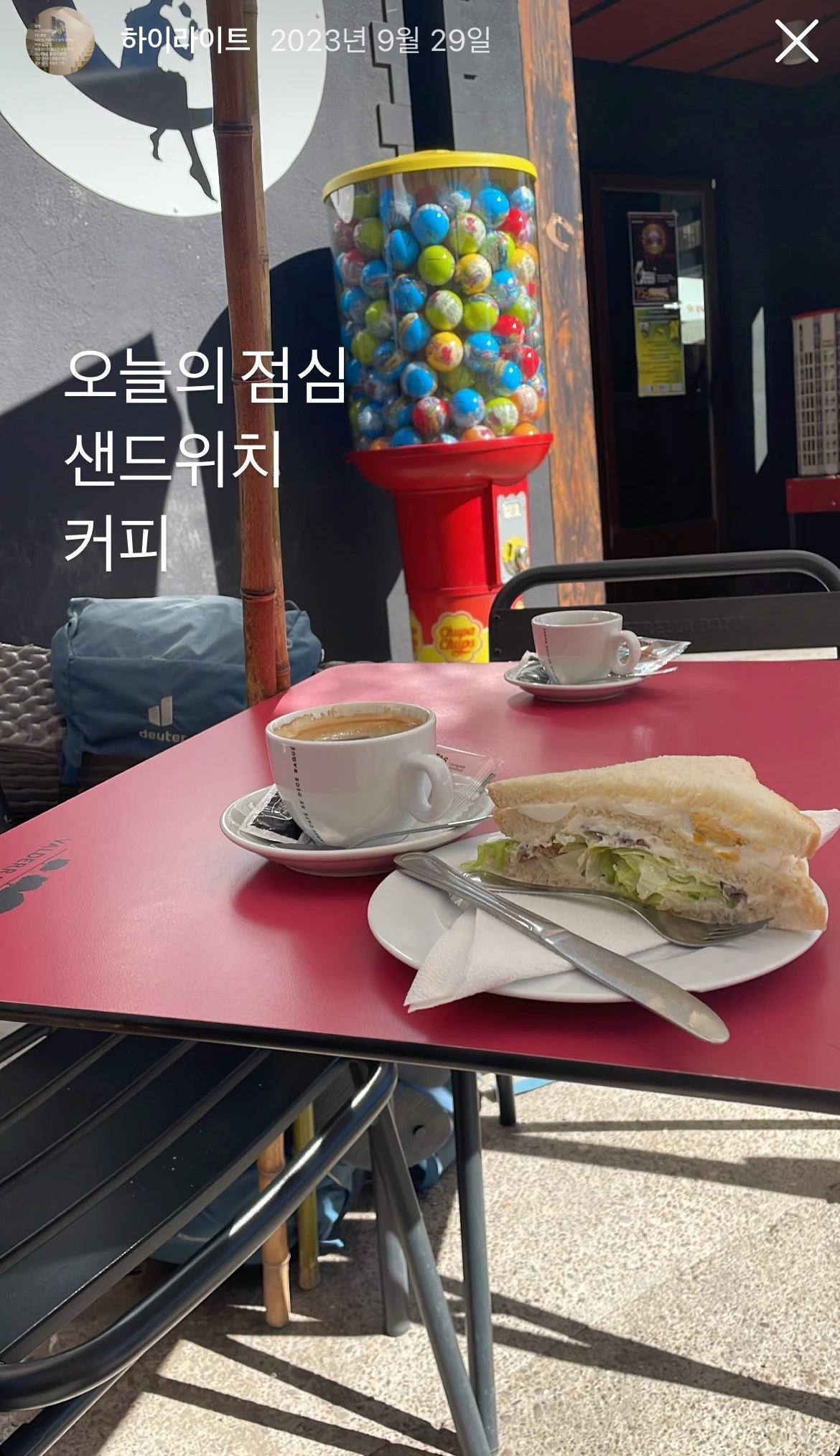 에스프레소를 사주었다. 나는 아메리카노와 샌드위치를 주문해서 잠시 해를 피하며 휴식시간을 가졌다.