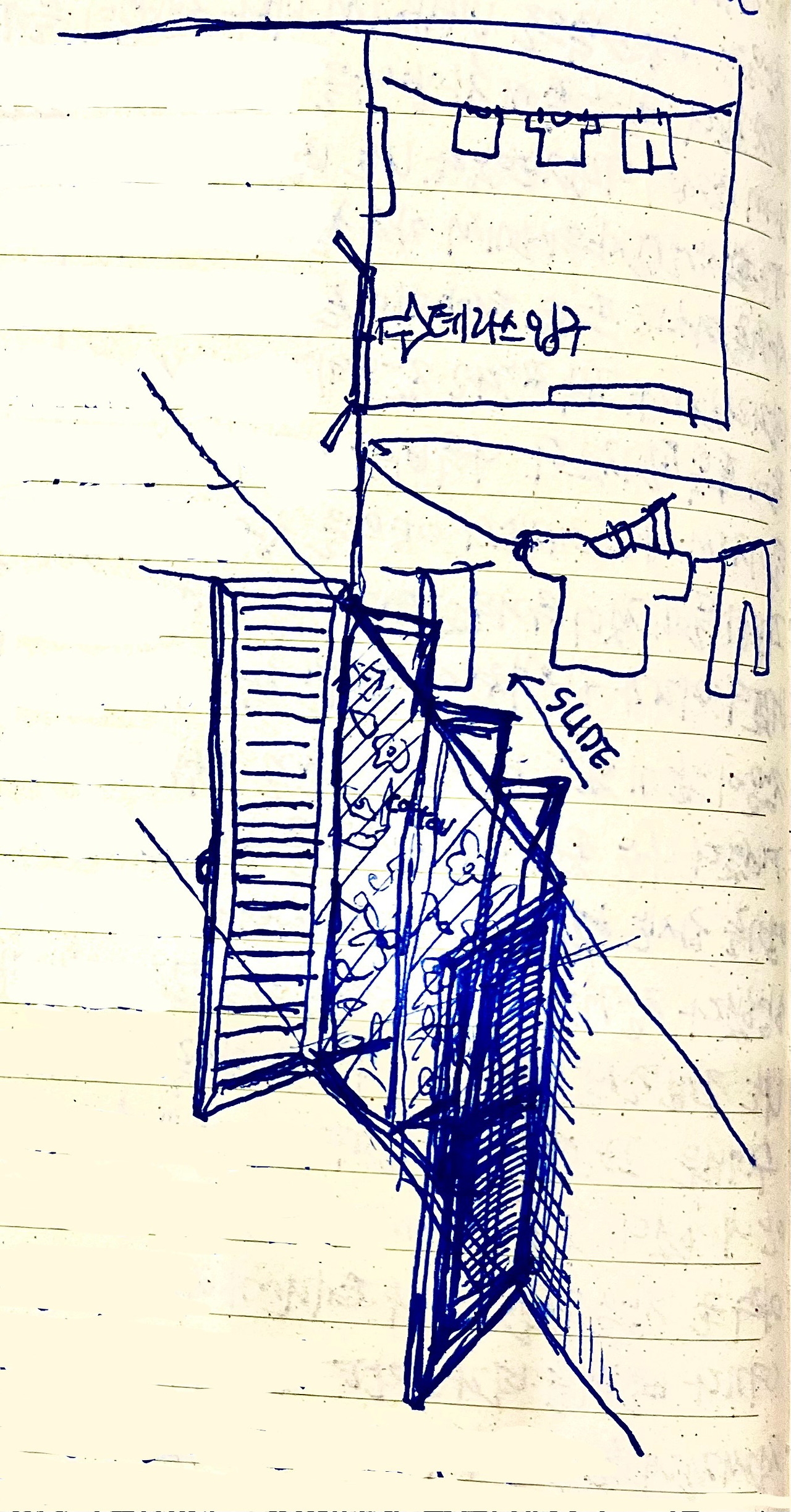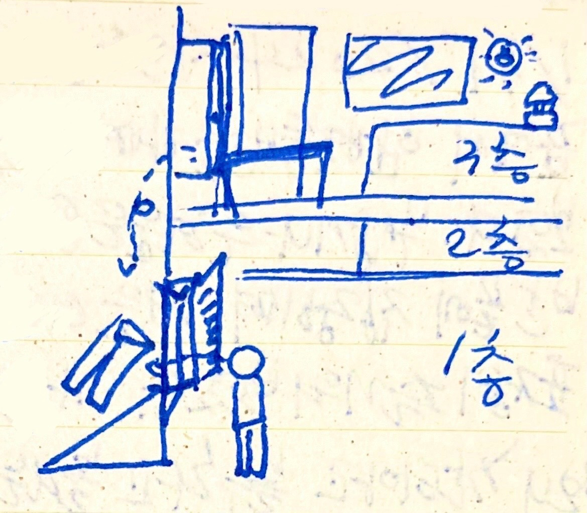 2층 빨래를 널어놓은 테라스 공간이 나왔다. 그러곤 여기에 빨래를 널라며 알려주시곤 아까처럼 이마에 손을 짚더니 한숨을 쉬시곤 다시 프런트로 돌아갔다.