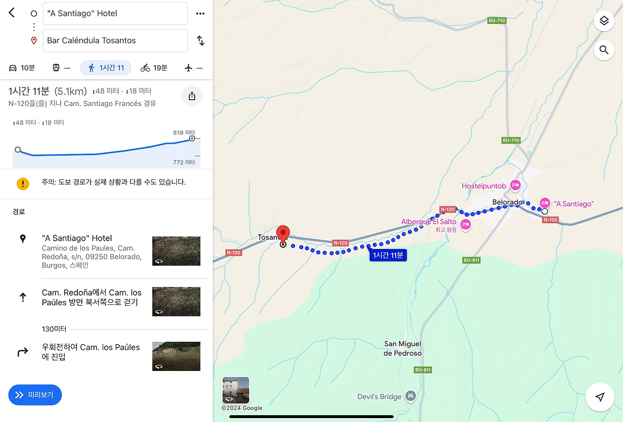기차로 마드리드까지는 2시간밖에 안 걸리고 걸어서 259KM/ Google은 이틀을 걸으면 마드리드에 도착할 수 있다고 했다. 구글이 로봇의 걸음걸이를 가지고 예측한 게 아닐까 싶은 거리였다. 지금 내가 생장에서 부르고스까지 걸은 걸음과 비슷할 정도로 먼 거리이다. 대략 열흘이 걸리는 거리인데 이틀이라니 말이 안 된다. 밥을 먹고 휴식을 취하는 시간은 뺀 거리일 것이다.