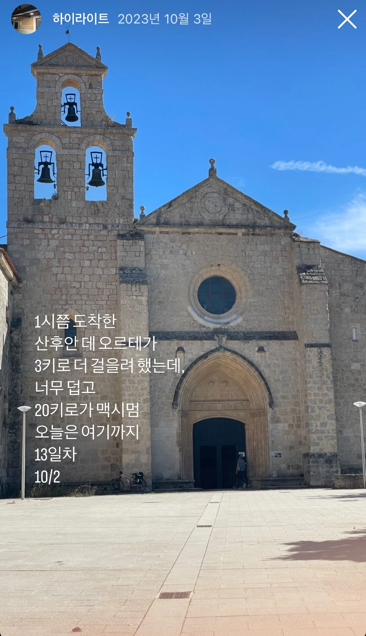 있는 그대로의 나를 받아들이는 것! 늘 항상 교훈적일 수는 없지만 매일의 나를 채워 넣어 조만간 1차 고지가 보이는 부르고스로 간다는 것만으로도 기분이 벅찬 하루였다.