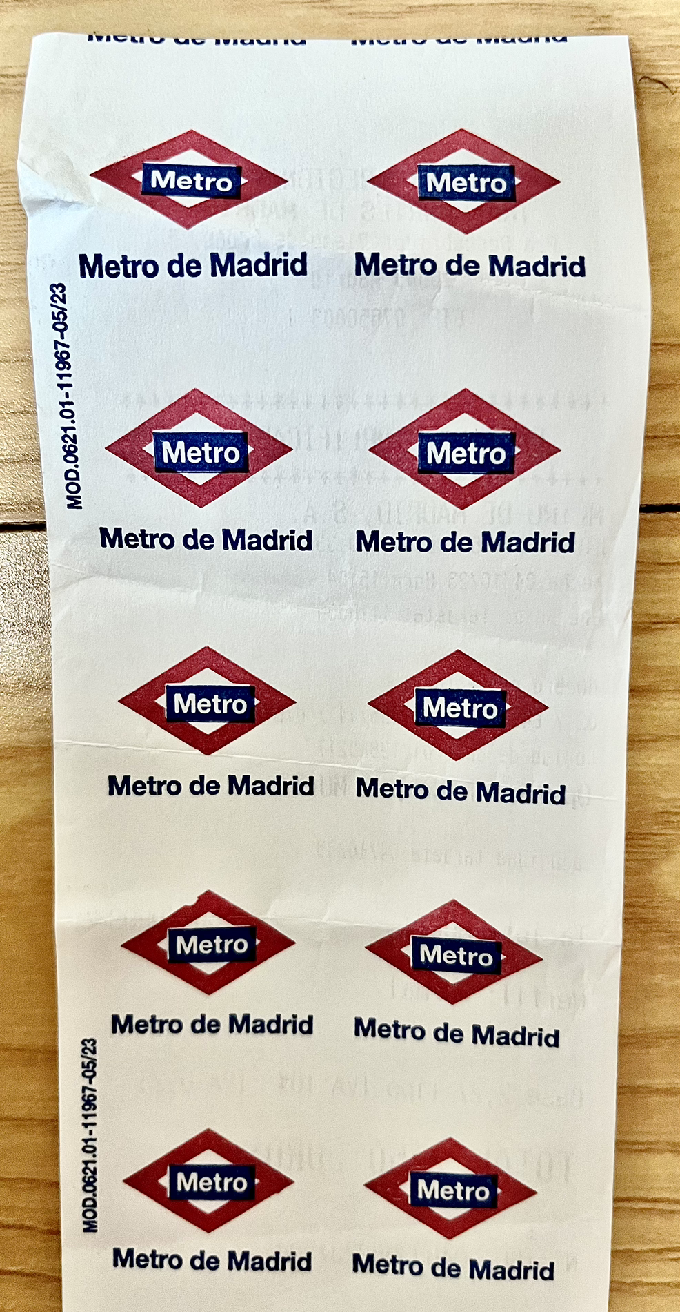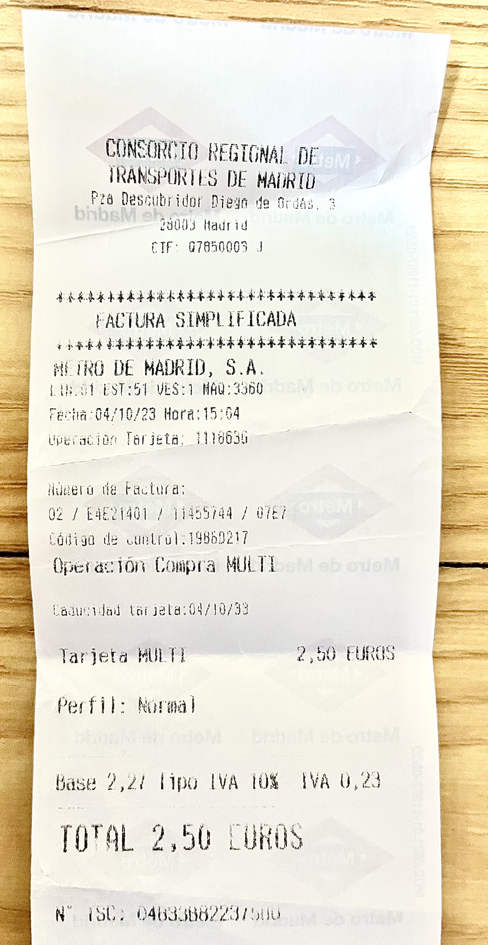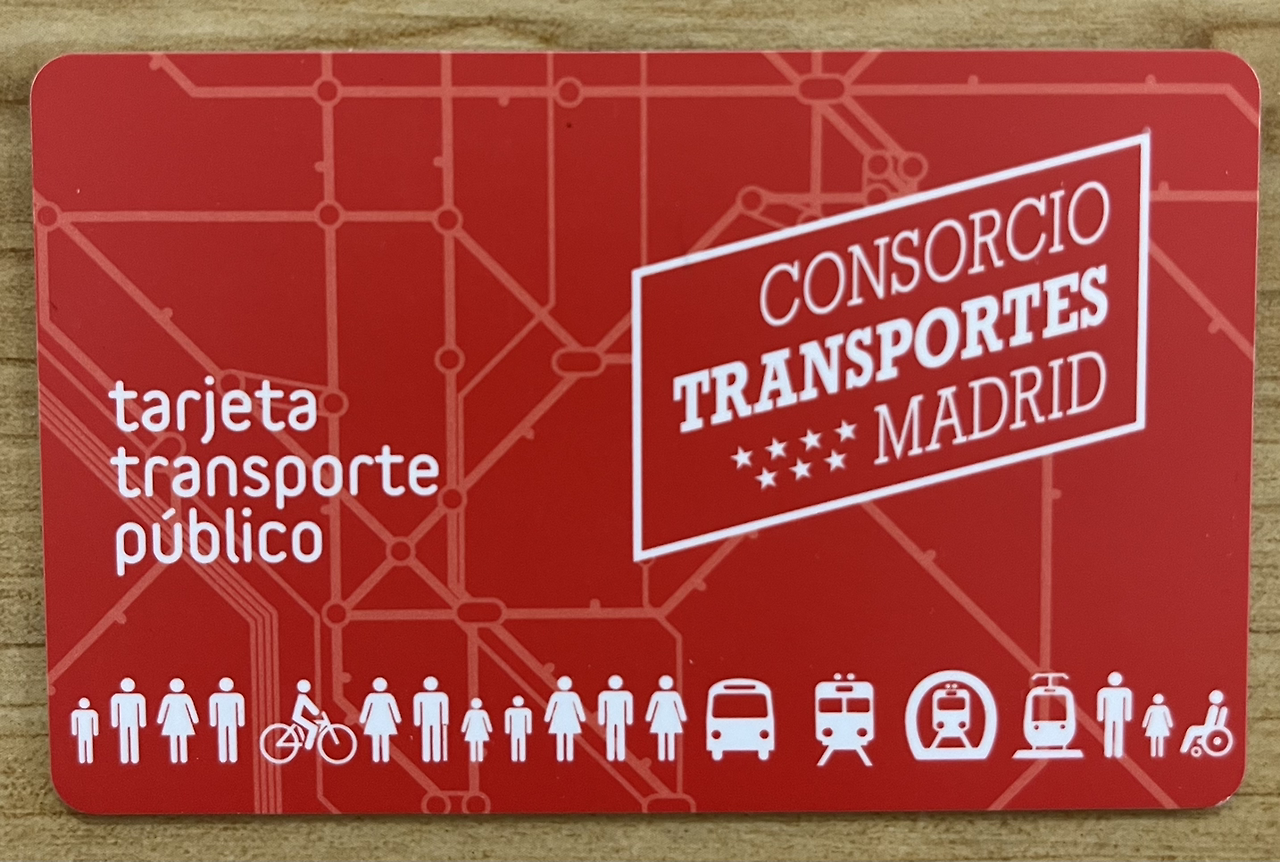 빨간색 교통카드와 결제로 나온 영수증 뒷면의 마드리드 지하철 로고가 마음에 쏙 든다.