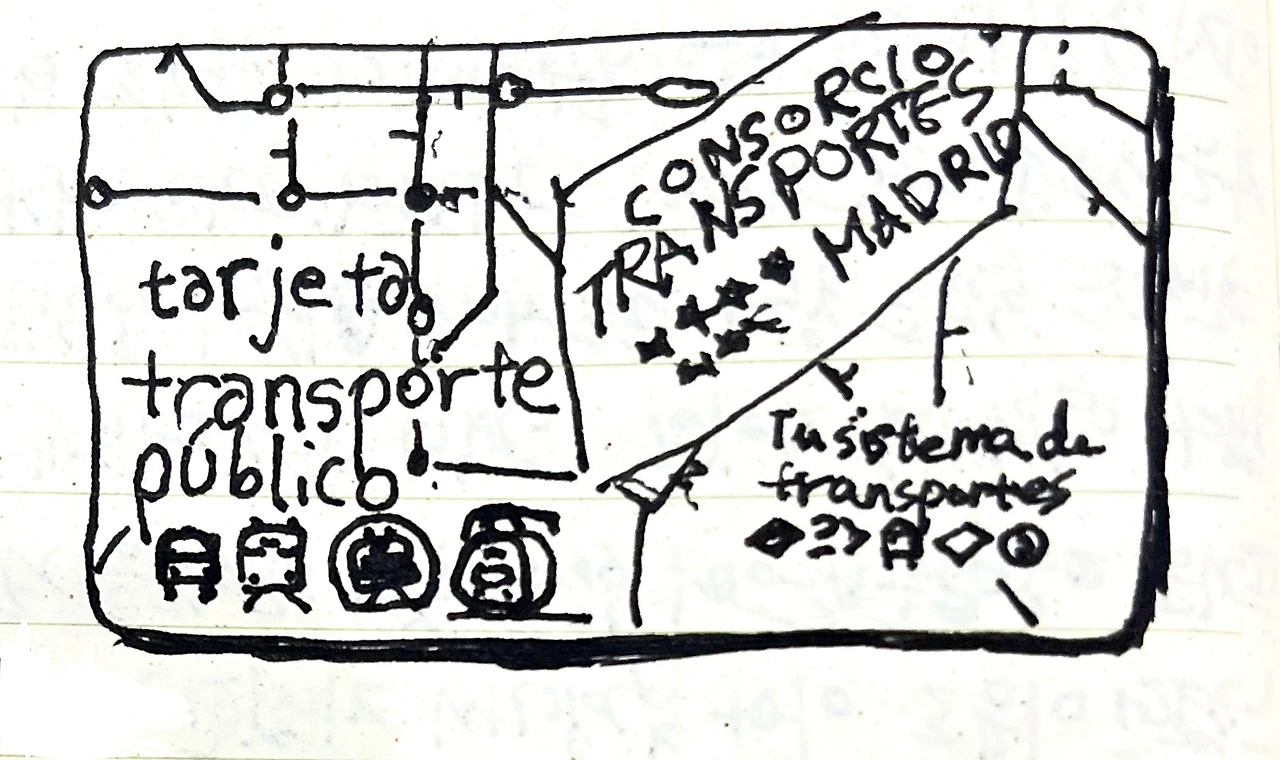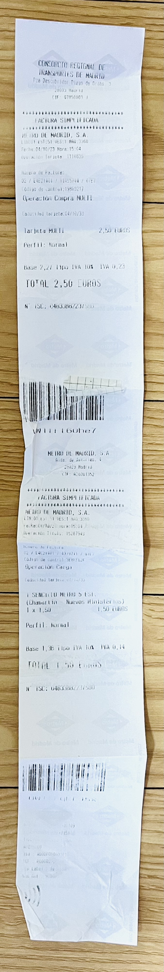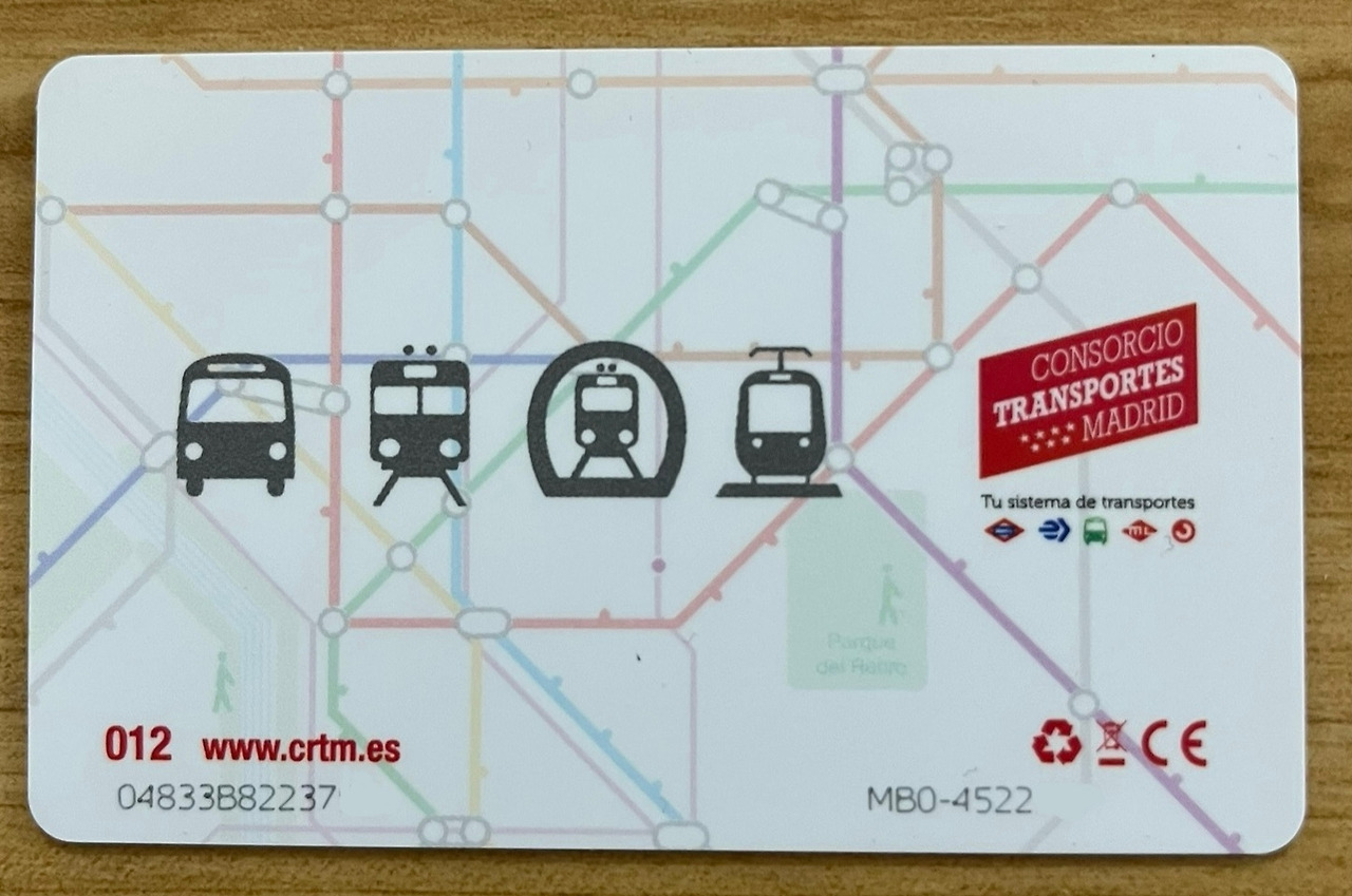 빨간색 교통카드와 결제로 나온 영수증 뒷면의 마드리드 지하철 로고가 마음에 쏙 든다.