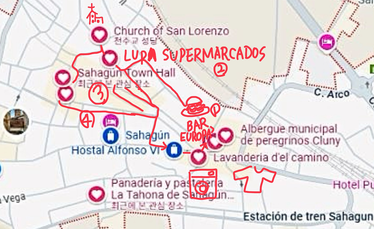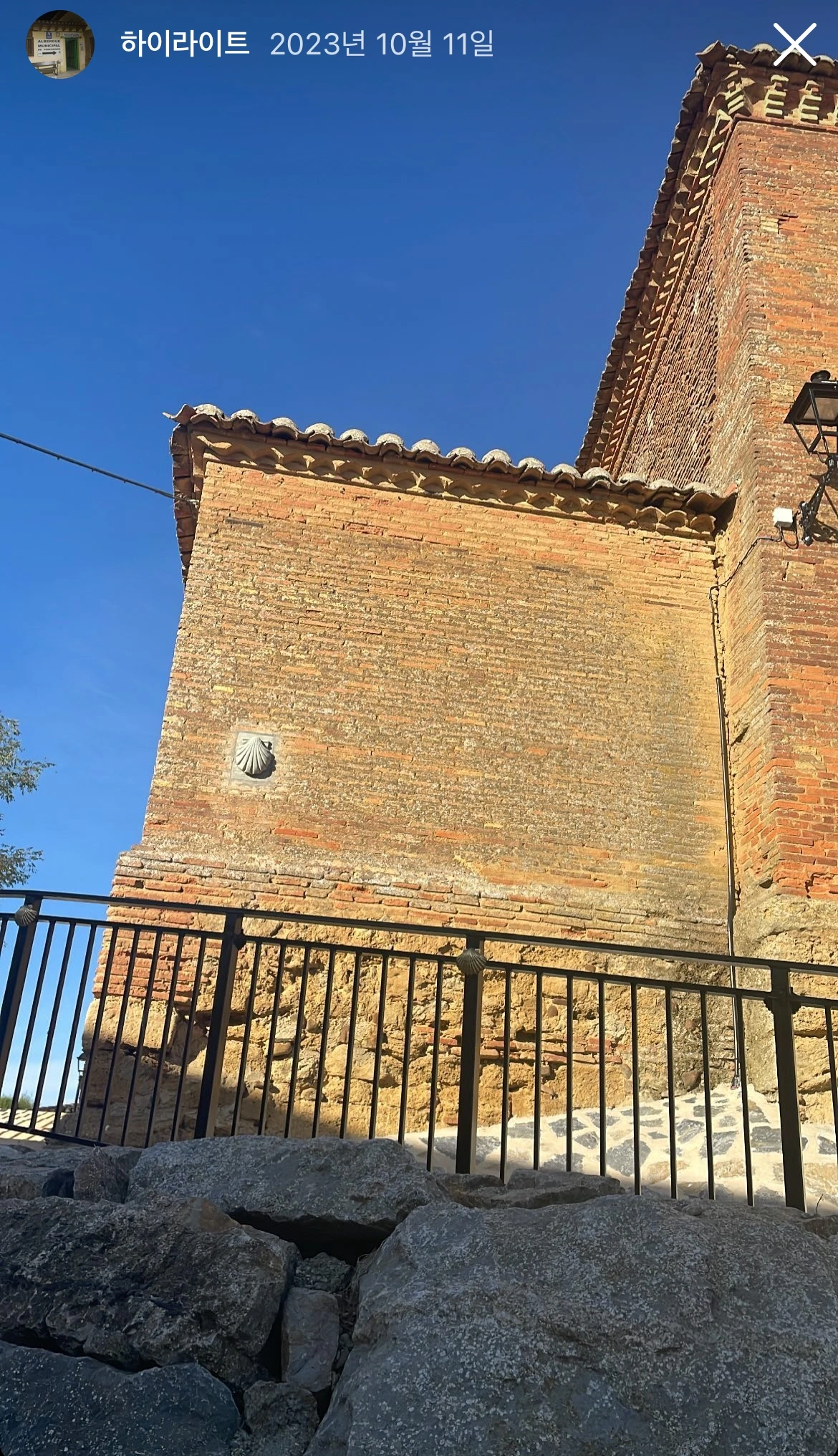 3시에서 4시경 숙소에 도착하기 전 짐을 메고 마지막 힘을 짜내며 다리를 건너 택시와 버스정류장을 지나쳤다. 마을 중심부 성당에 도착하자 미리 도착해 쉬고 있던 순례자들이 보이기 시작했다. 다들 짐을 풀고 앉아서 맥주를 마시며 시에스타를 즐기고 있었다.