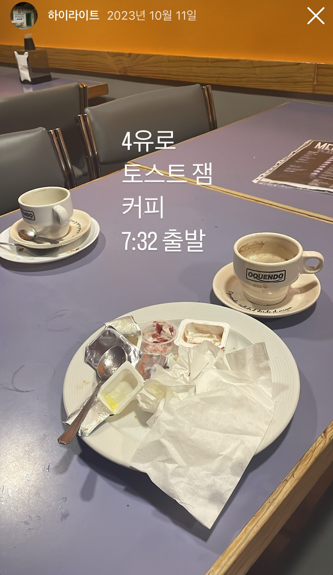 새벽시간 칼자딜라 데 라 쿠에자의 작은 마을에 유일하게 문을 연 리얼 카미노 알베르게 겸 카페가 불을 밝혔다. 나는 4유로짜리 토스타다 마믈라다와 카페 콘 레체를 시키고는 개눈 감치듯 먹었다. 맛도 맛이지만 아침 일찍 당과 커피를 밀어 넣어 나아갈 연료 충전이 먼저이다.