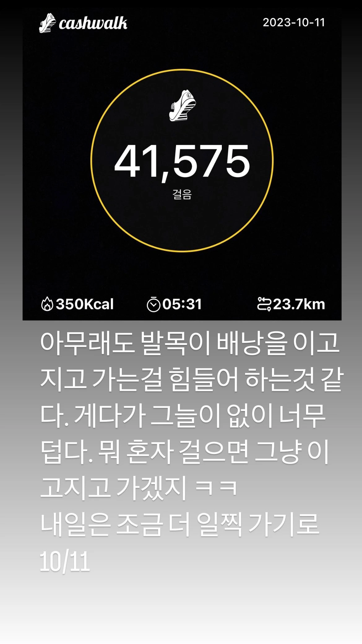 캐시는 내일 몸상태를 봐야 할 것 같다고 한다. 왜냐하면 평상시 10km씩 걷는데 오늘 나와 함께 걸으며 23km를 걸었으니 몸이 무리를 한 모양이다.