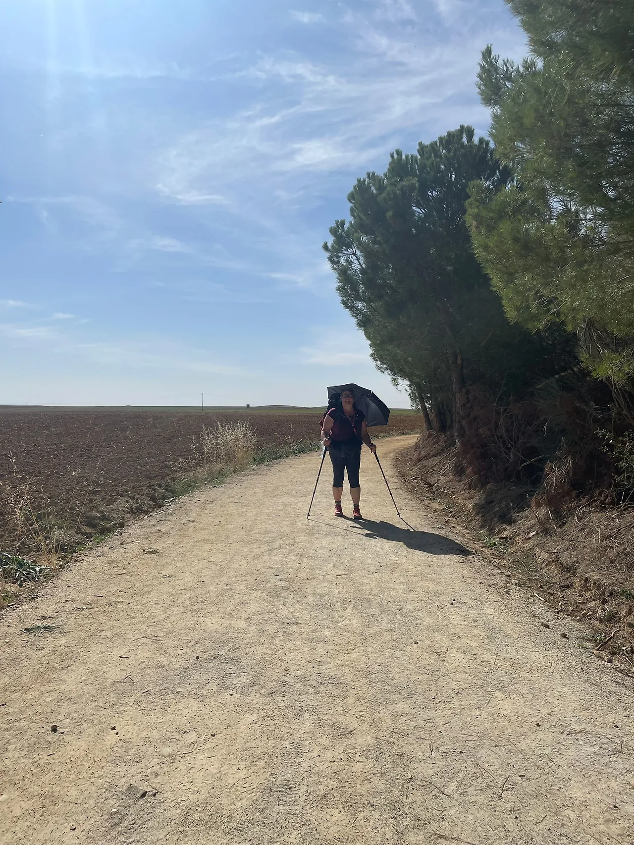 노래를 부르며 걷기에도 지칠 정도로 금세 태양이 우리의 걸음을 따라잡았다. 우리는 걸으면서 스스로 그늘을 만들어야 했다. 내가 터득한 방법은 보이기는 우스꽝스러웠지만 효과는 만점인 모자 위에 윈드점퍼를 얹어서 어깨까지 가리는 방식이었고, 캐시의 경우 부르고스에서 구입한 양산을 배낭 가슴줄과 가슴에 고정시켜서 그늘을 만들어 걷기 시작했다. 정말이지 탁월한 선택이 아닐 수 없다.
