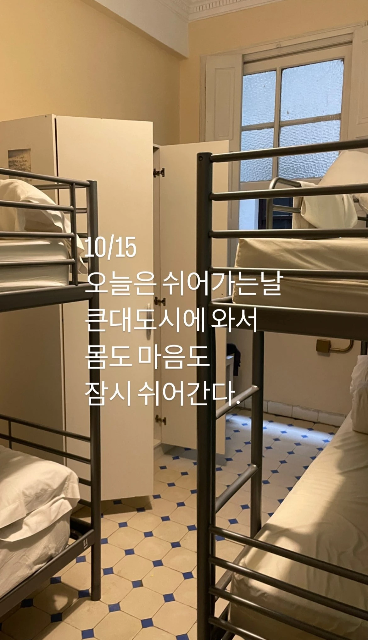 다행히도 밤 외출을 나가는 호스텔 숙박객이 우연히 서로 마주쳐 무사히 숙소로 들어갈 수 있었다. 3층으로 올라가 문을 두드렸는데, 소리를 듣고 한국인 순례자 아저씨가 문을 열어 주셨다. 아까 출입구에서 마주쳤던 커플은 알고 보니 같은 방을 쓰는 포르투갈 여행자들이었다. 낮시간에 오자마자 시에스타를 해서 얼굴을 제대로 못 봤는데 밤늦은 시간에 잘 차려입고 좋은 곳에 갔나 보다.