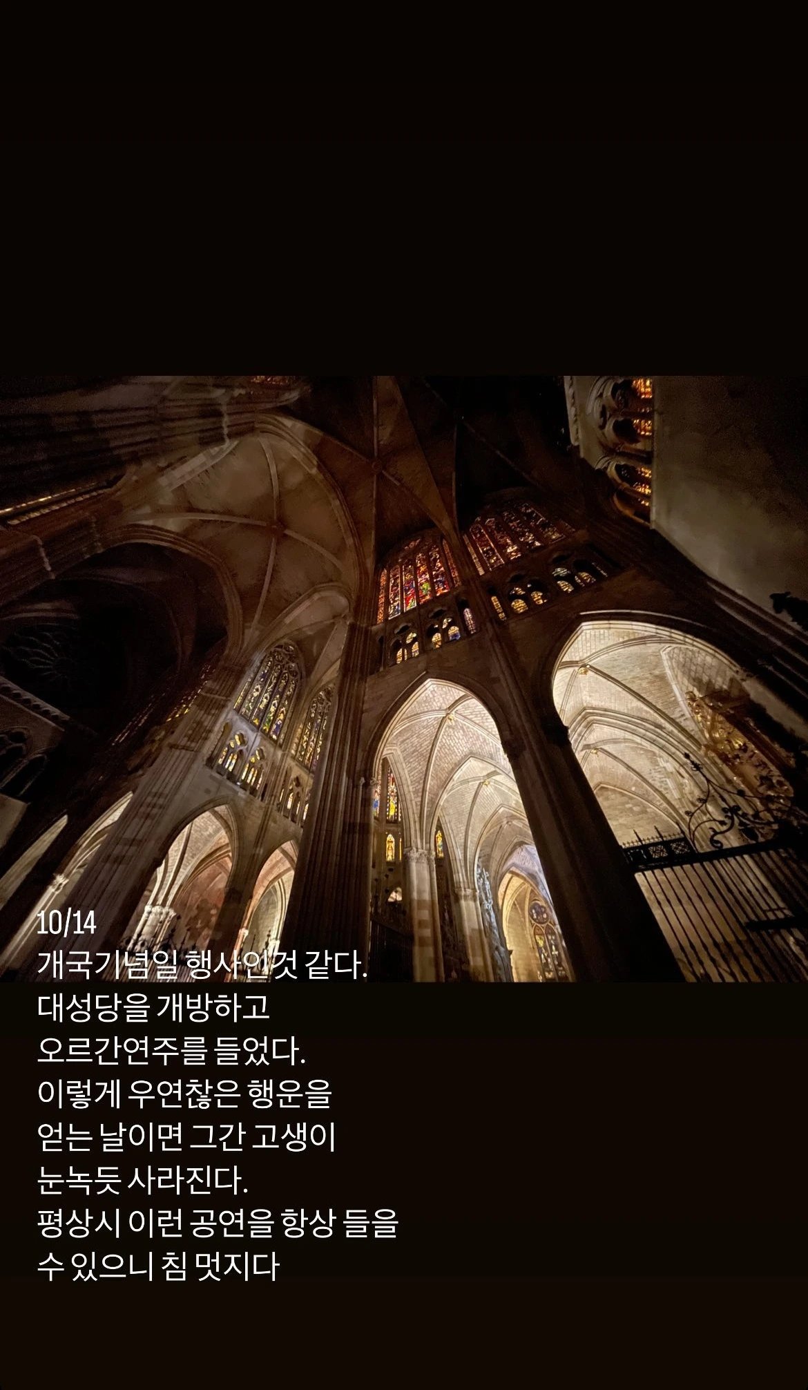 오르간 연주는 쉽사리 끝나지 않았다. 클래식 연주 중에서도 가장 하이레벨의 인간의 깊은 내면을 굵게 울리는 오르간 연주로 표현하고 있었다. 듣기가 쉽지 않았지만 이런 공연은 내가 또 언제 한번 들을 수 있을까라는 생각으로 끝까지 공연을 관람했다.