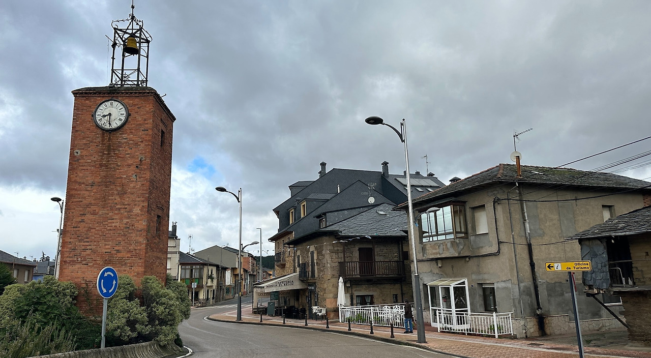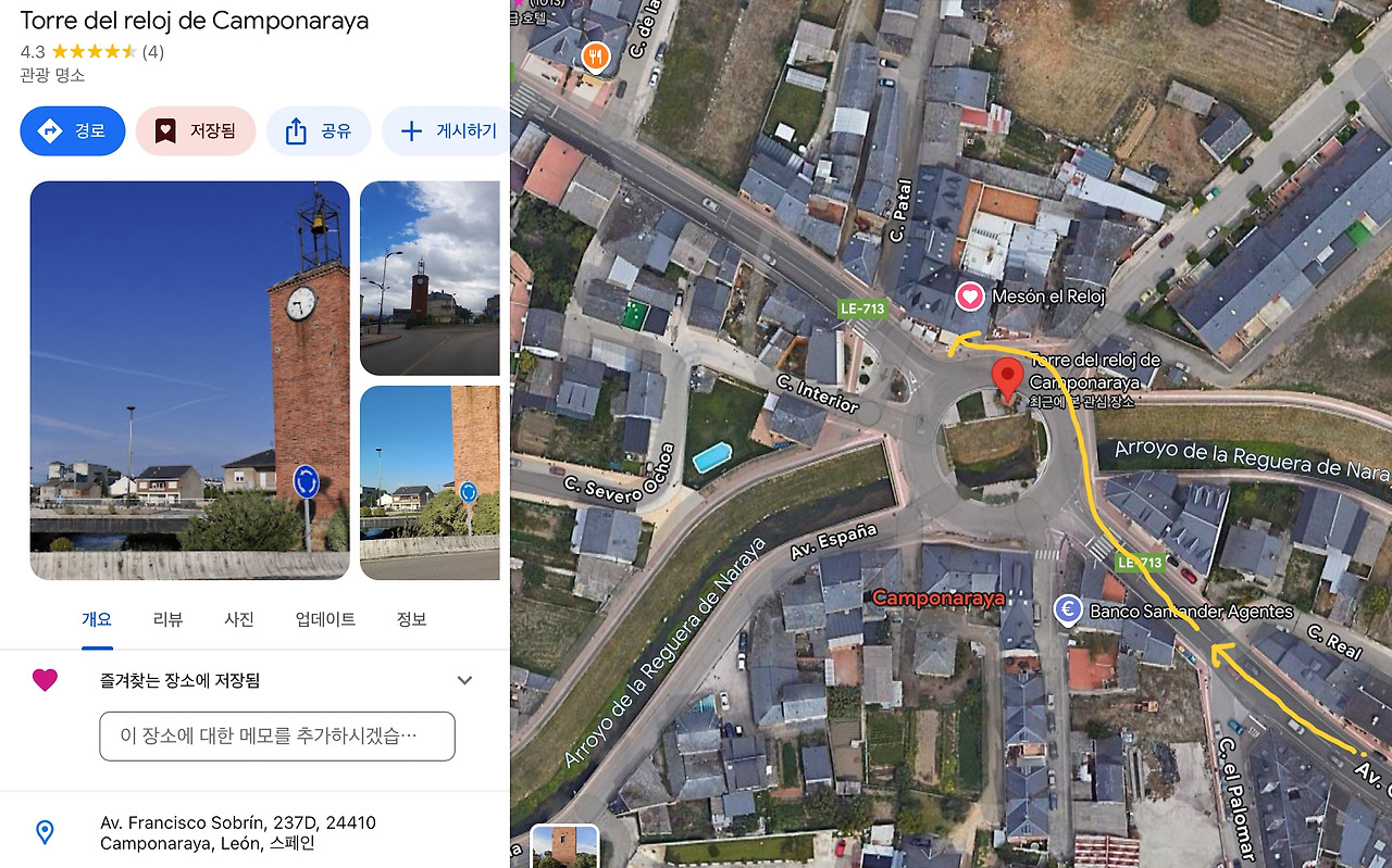 캄포나라야에 도착했을 때, 마을 입구부터 아기자기한 건물들이 눈에 들어왔다. 마을의 입구에는 Torre del reloj de Camponaraya 시계탑과 아름다운 순례자 동상이 있는 수돗가가 보였고, 원형 교차로의 풍경이 한눈에 펼쳐졌다.