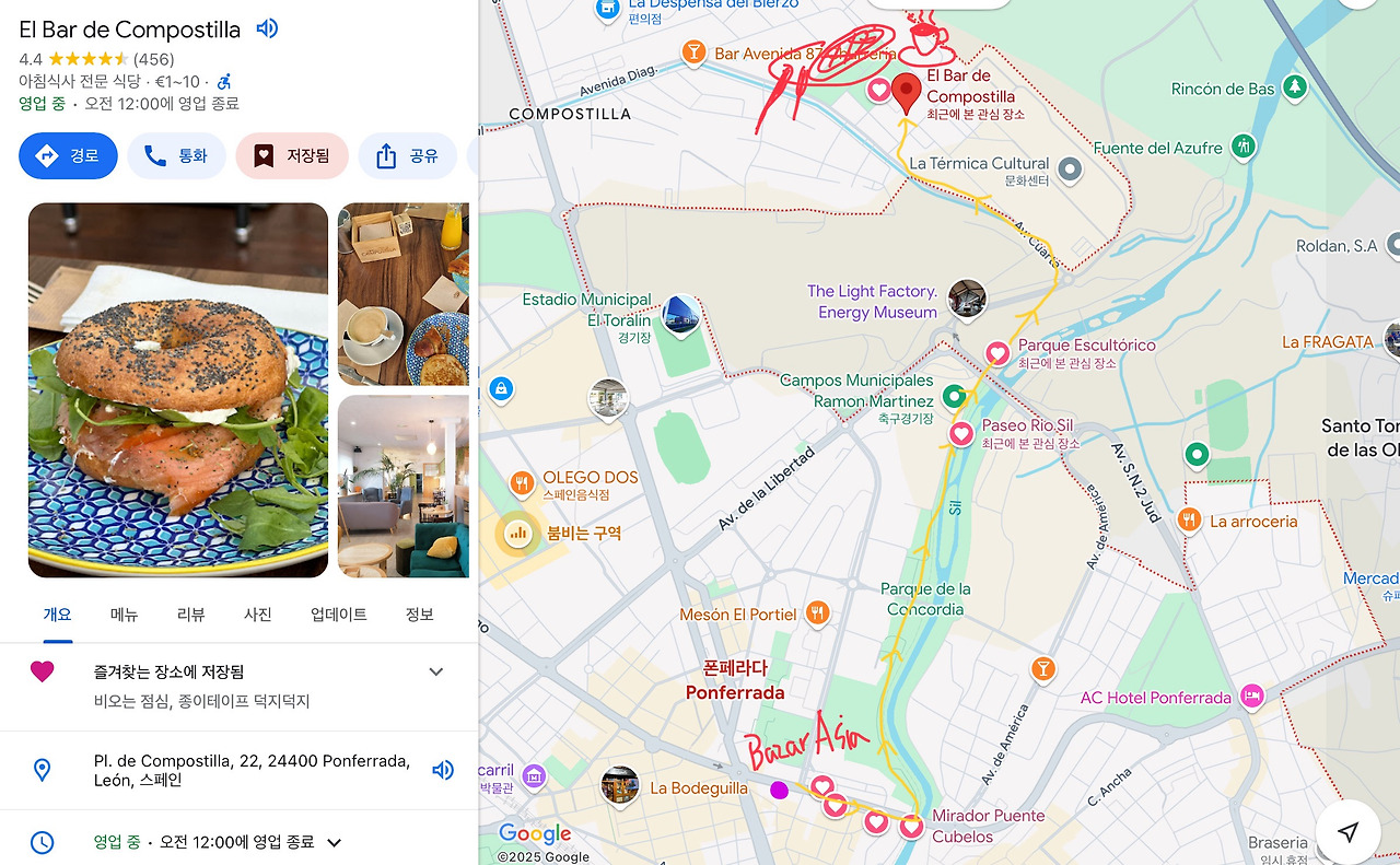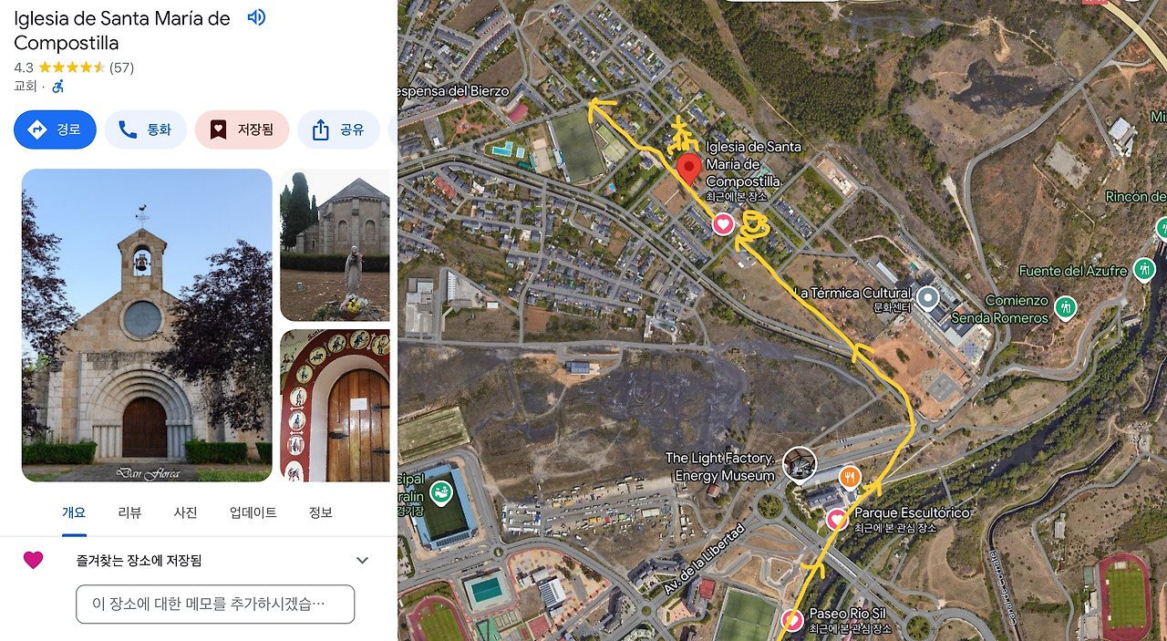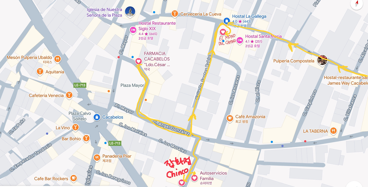 산티아고 프렌치 웨이 한국 앱과 구글 지도를 통해 내가 걸었던 길을 살펴보니, 애초에 순례길 루트로 설정된 경로와 내가 잡화점에서부터 콤포스틸라 카페까지 걸었던 길이 경로를 벗어나 있었다.