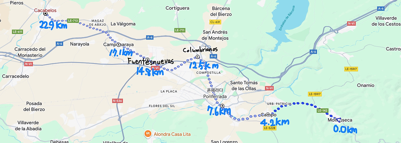 다음 목적지는 카카벨로스(Cacabelos)로, 약 22.9km 떨어져 있다. 호스트에게 내 가방을 잘 부탁한다는 메시지를 왓츠앱으로 보내놓았다.