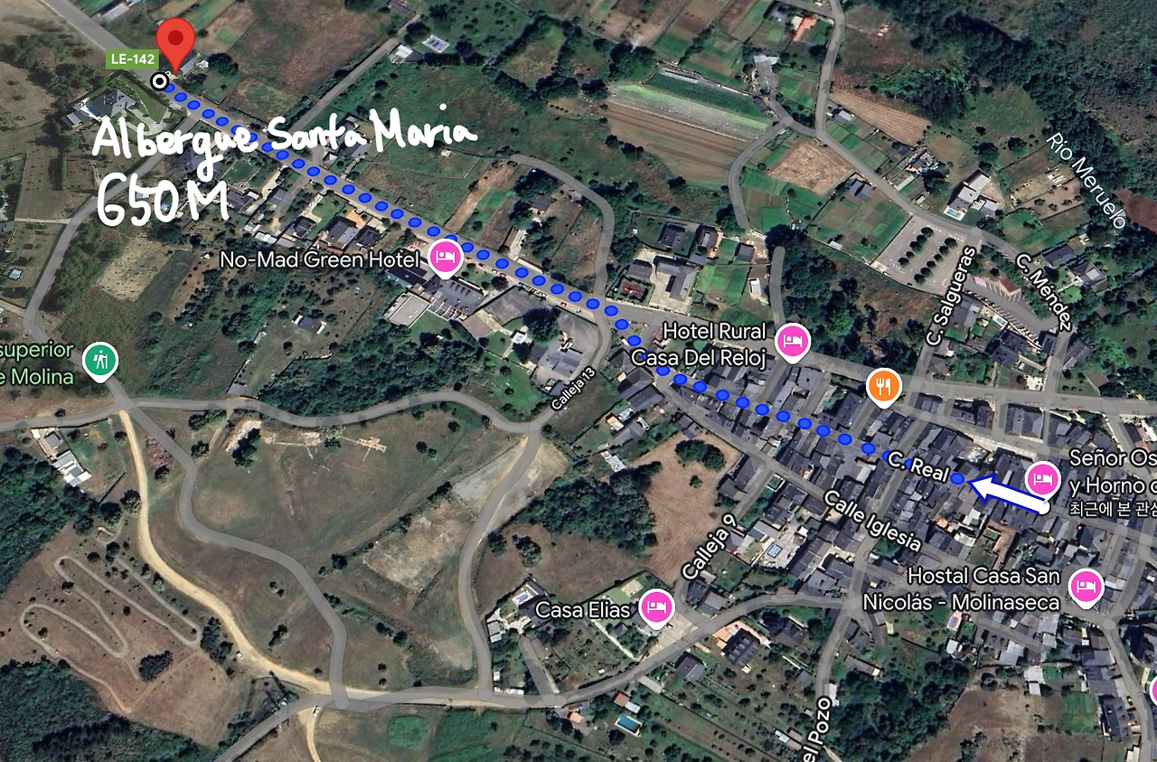 콜롬브리아노스를 CL-631 도로를 따라 마을에 진입했다. 마을에는 아기자기하고 소박한 카페와 휴식처들이 줄지어 있었다. 나는 폰페라다에서 많은 시간을 보냈고, 몰리나세카에 도착했을 때처럼 늦은 시간에 숙소에 도착하는 것을 원치 않았기 때문에 서둘러 길을 재촉하며 걸었다.