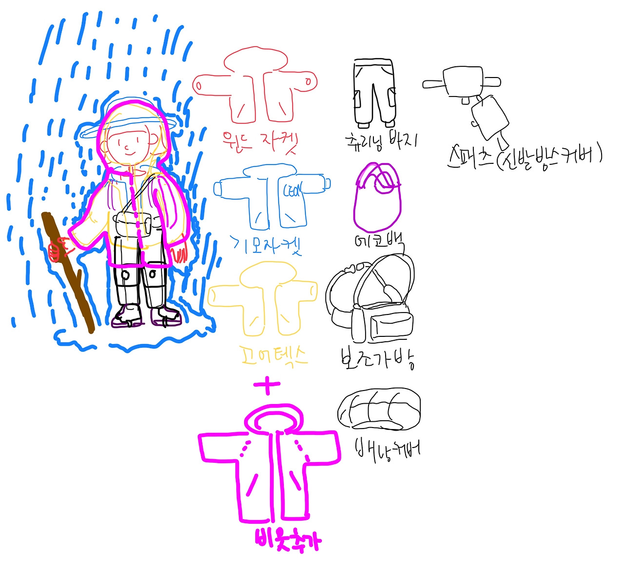 짧은 인사를 나누고, 나는 이층으로 올라가 분홍색 비옷을 골랐다. 세 가지 디자인의 비옷이 있었는데, 남성용 비옷과 비옷 바지까지 있는 걸 살까 하다가, 짐이 늘어나는 게 싫어서 급히 가벼운 분홍색 비옷을 고르게 되었다.