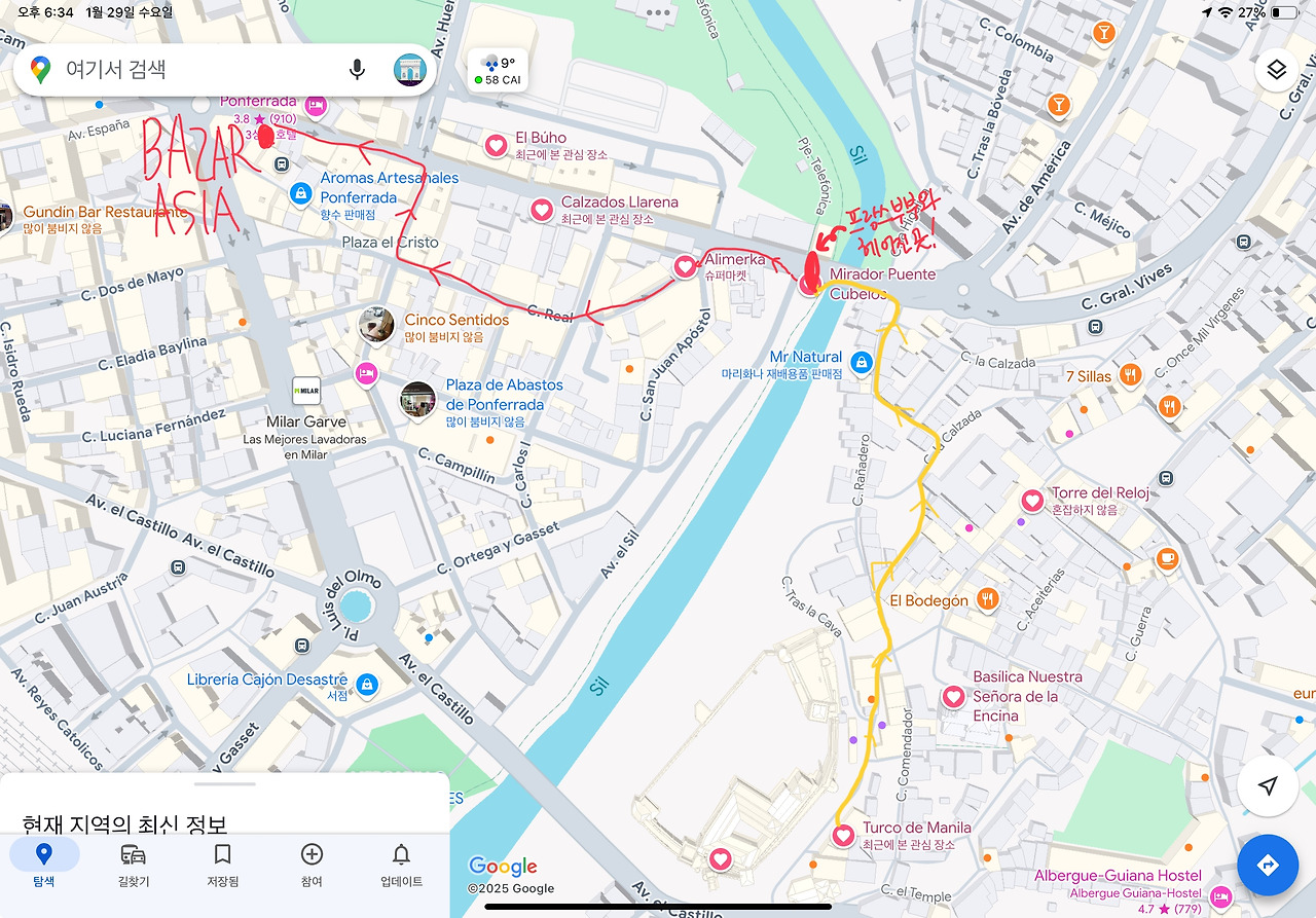 기사단의 성 앞 카페에서 수잔을 만났을 때는 비옷을 사야겠다는 생각이 크게 들지 않았으나, 프랑스 부부와 유적지의 시계탑, 성당, 기사단의 조각상을 지나며 계단이 보이는 Minador Puente Cubelos에 도달했다. 경사진 계단을 내려가며 산티아고 길로 가는 중, 슈퍼마켓이 근처에 있다는 것을 발견했다.