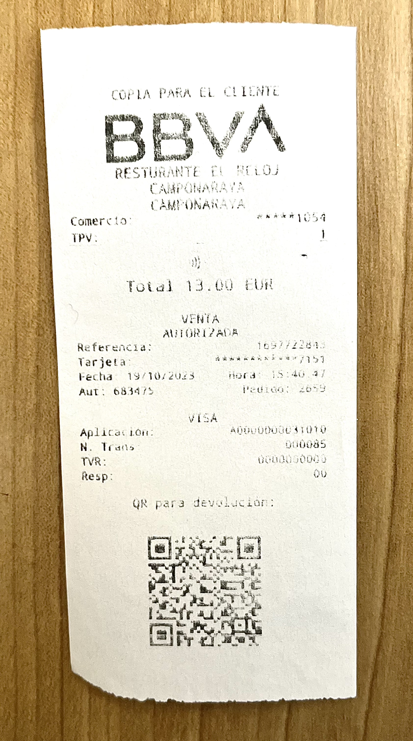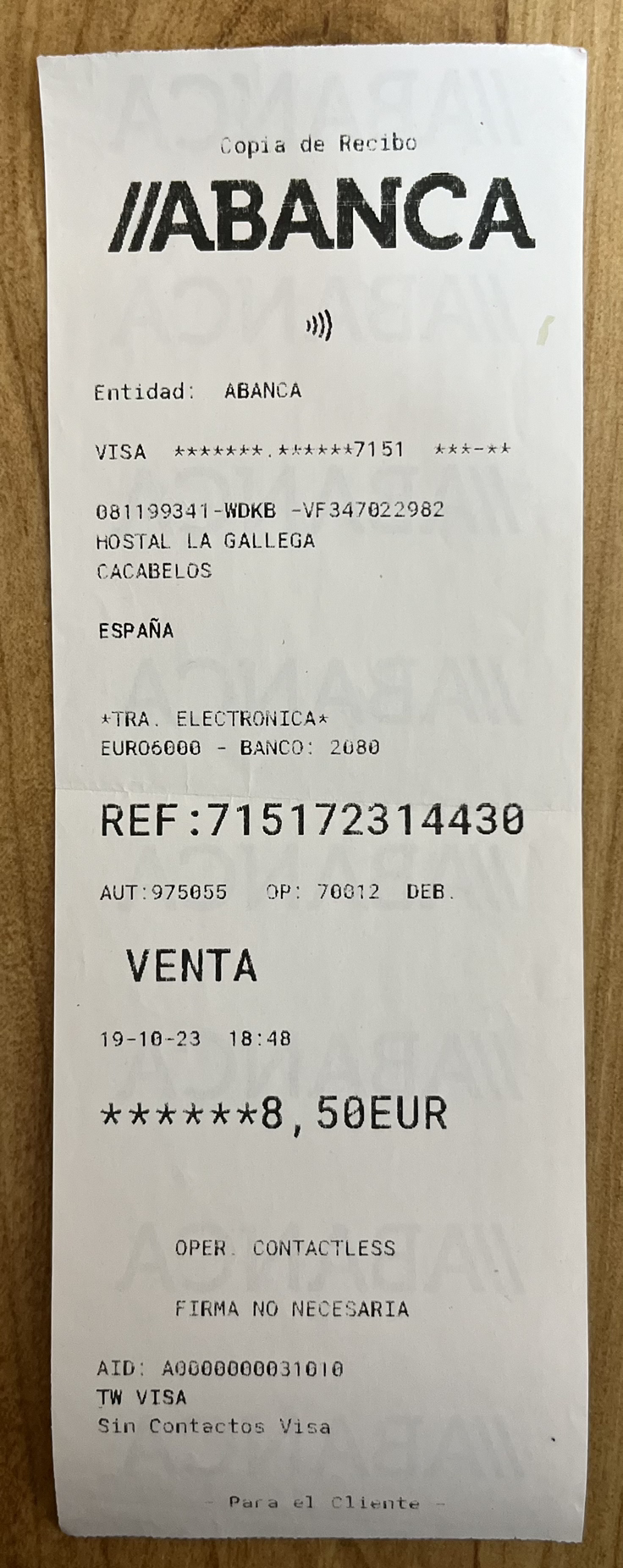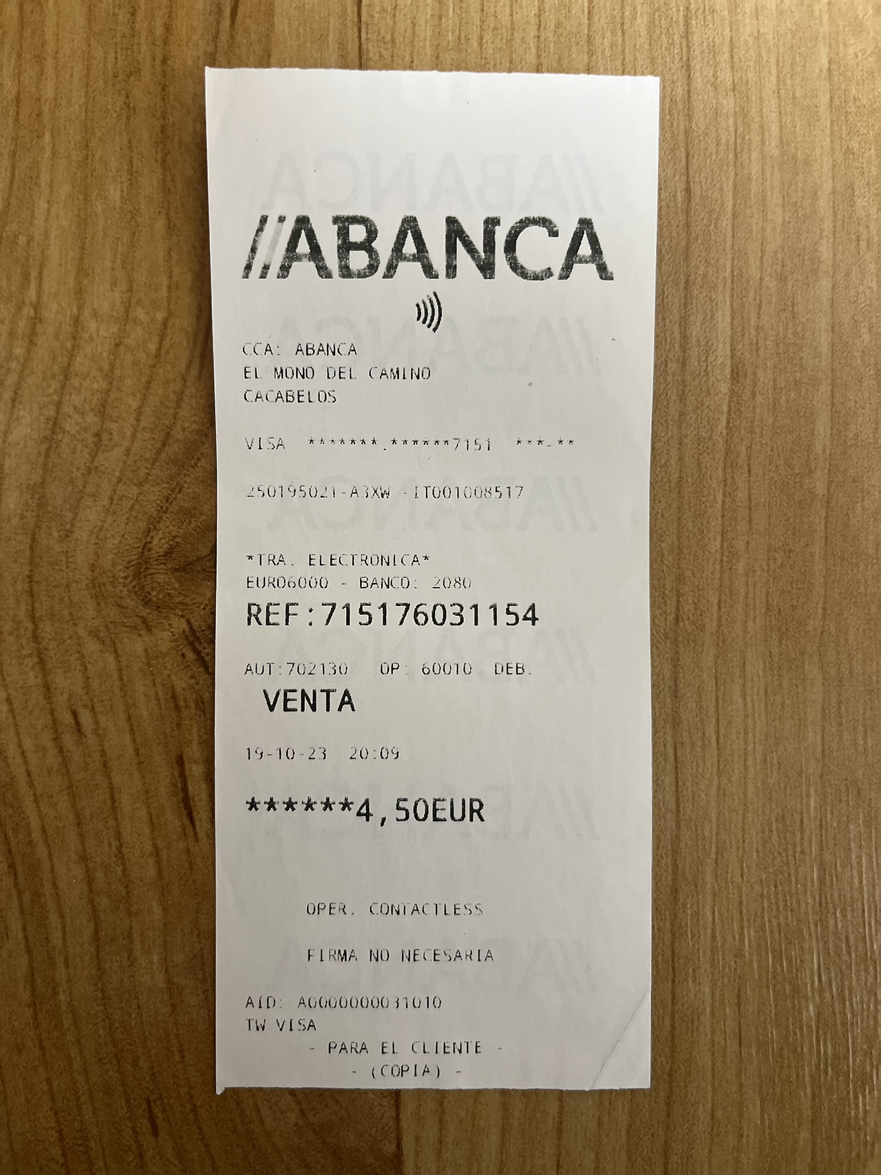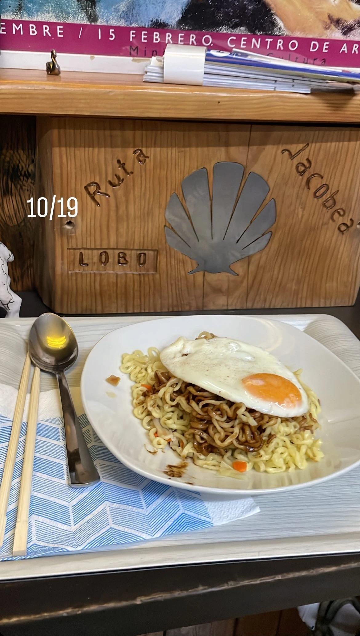 음식점은 외관과 달리 내부가 꽤 큰 규모였다. 현지 사람들이 가득 차 있었다. 스페인에서는 2시부터 4시까지가 본격적인 점심시간이기 때문에, 일단 젖은 우비와 배낭을 문 근처에 벗어두고 안으로 들어갔다. 우비를 벗을 때 겨드랑이 부분이 찢어진 걸 발견하고, 그들은 무슨 있었던 거냐며 물었다.