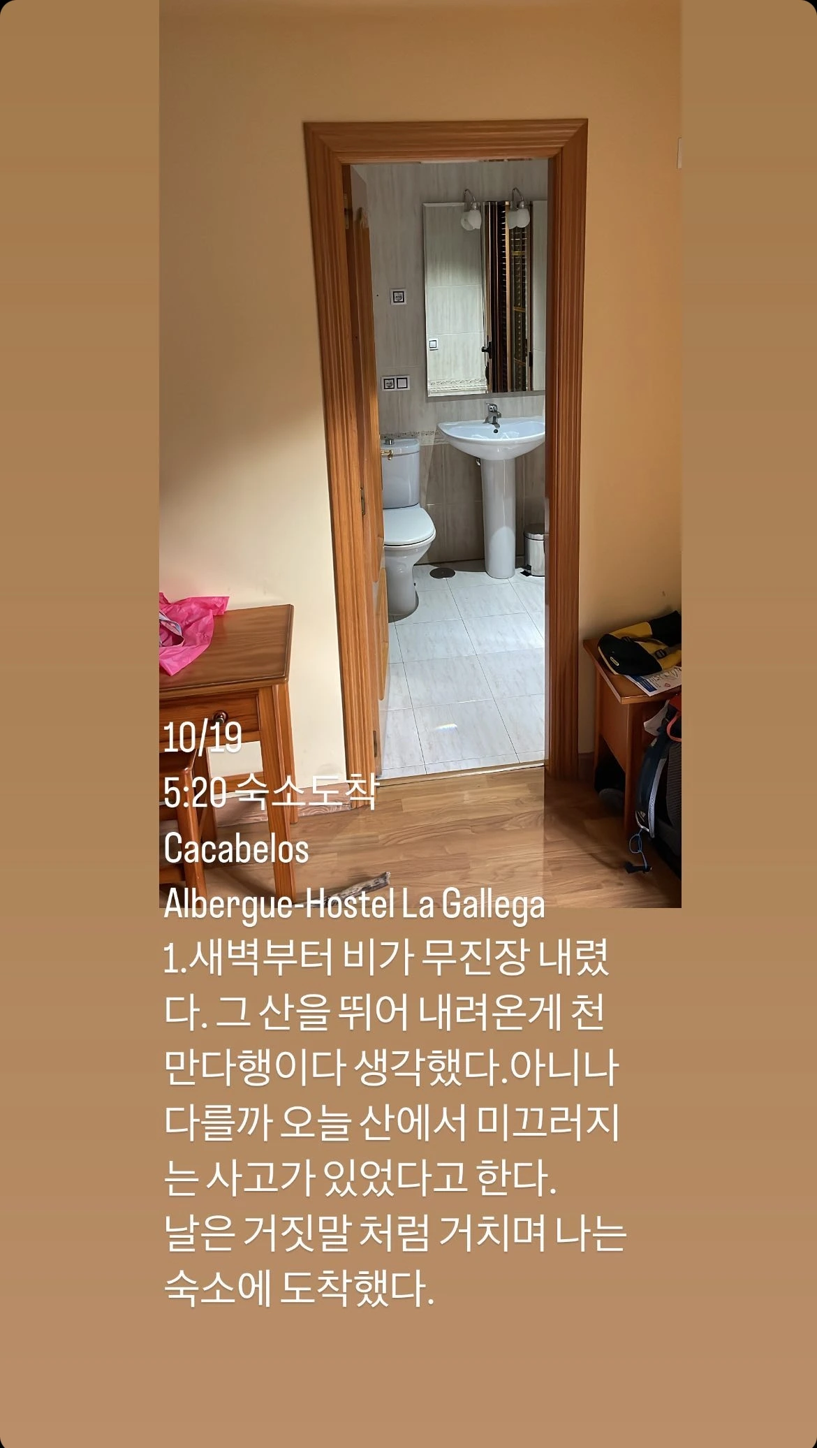 숙소는 4인실에 화장실이 딸린 깔끔한 숙소였다. 숙소 이름은 Albergue-Hostel La Gallega였고, 1층 침대 자리는 이미 누군가 차지한 후여서 나는 결국 또 만년 2층 침대를 써야 했다.