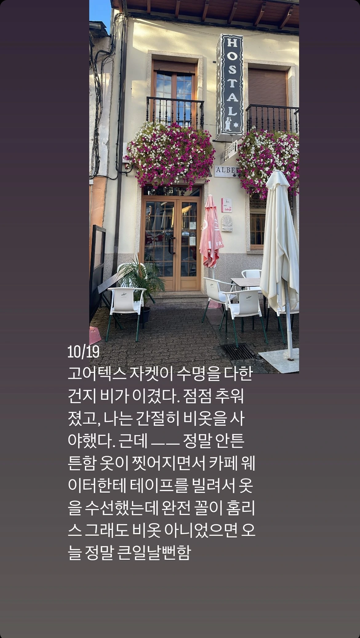 가방 무게 때문에 파리 언니 집에 두고 온 판초가 떠올랐다. 레온에 도착할 때만 해도 비옷을 챙기지 않은 걸 칭찬했었는데, 그때 그 선택이 이렇게 아쉬워질 줄이야.
