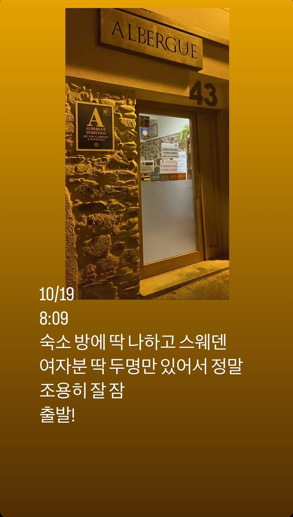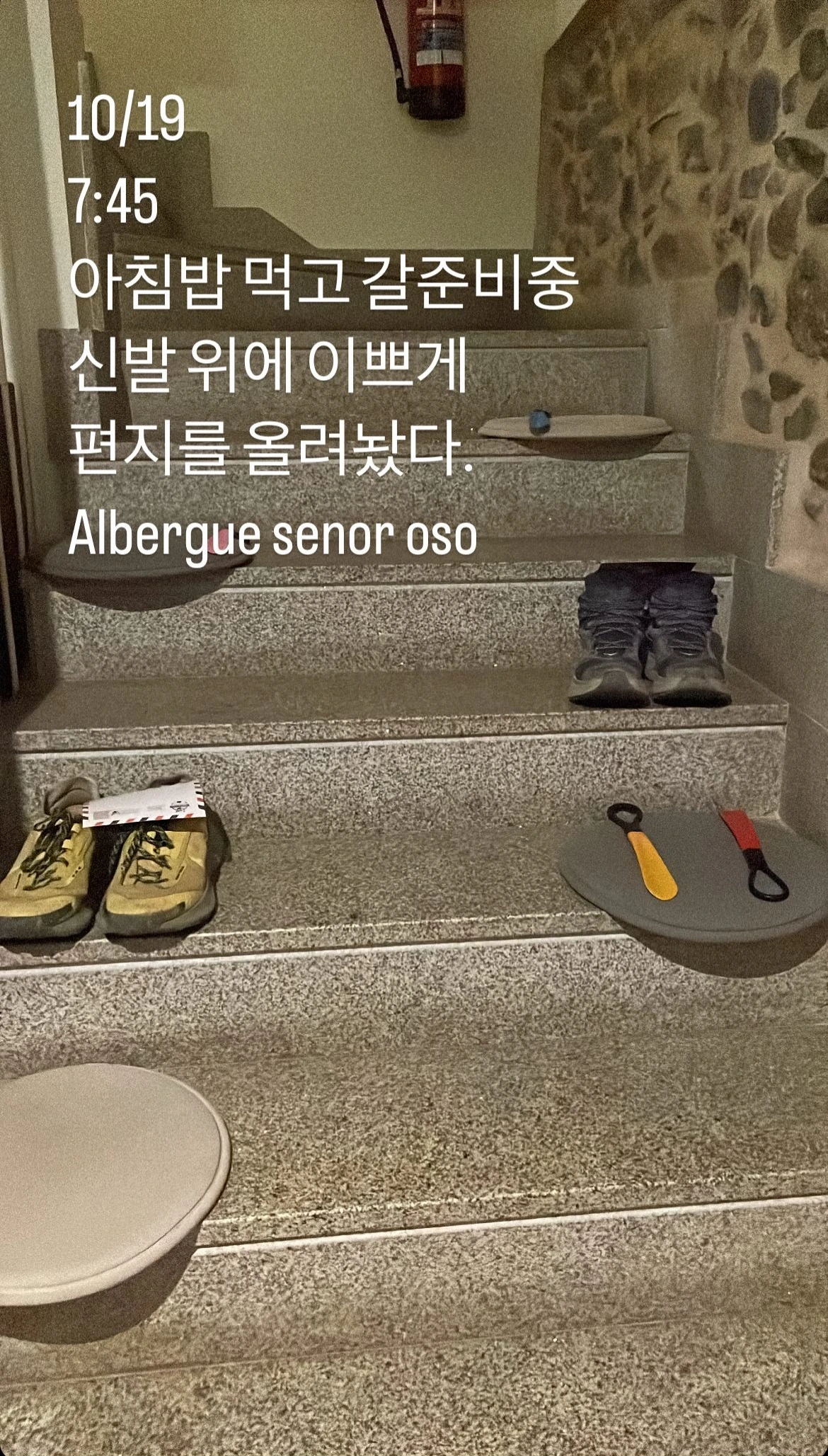 방으로 돌아오니 독일인 순례자 분이 벌써 잘 준비를 하고 계셨다. 우리는 밥 먹기 전, 통역 앱으로 떠들었던 수다 덕분에 방 분위기가 한결 편해져 있었다. 스페인 아저씨는 내일 일찍 출발할 예정이라며 나에게 '코를 골지 말라'며 농담을 건넸다.