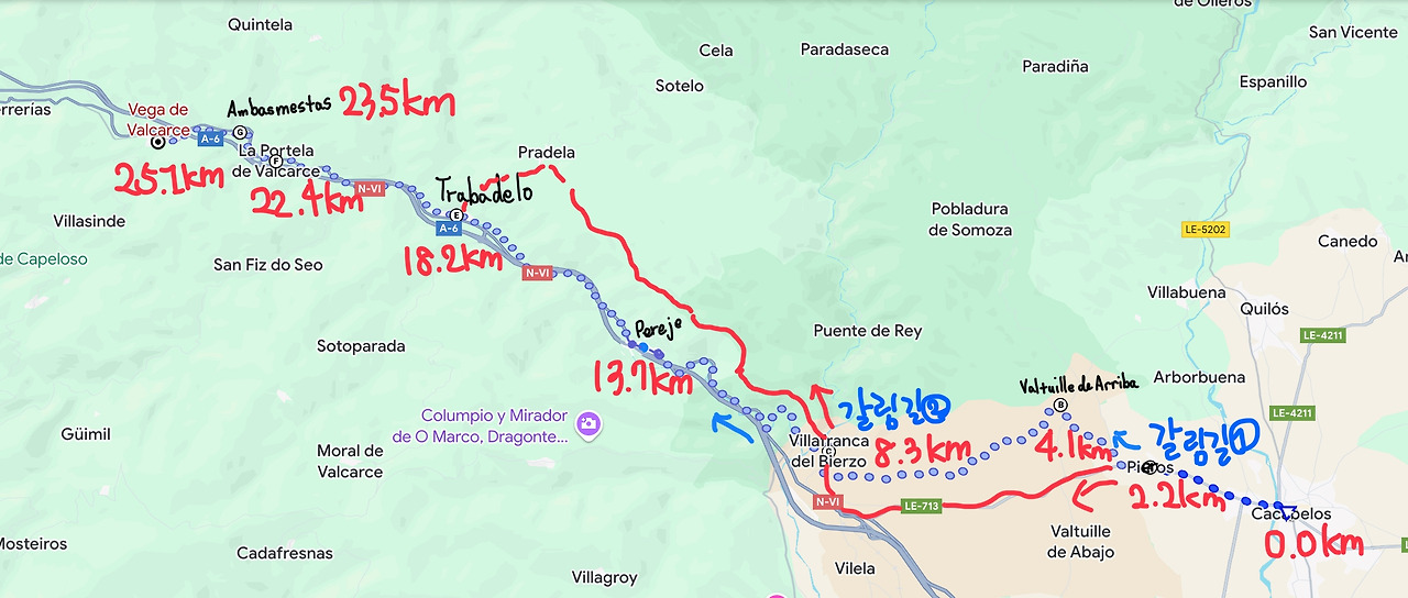 까미노 앱에서는 이 길에서 다리 아래로 직진하라고 가리키고 있었다. 나는 아스토르가에서 새벽길을 걸었던 실수를 반복하지 않기 위해, 카미노 앱 세 개를 켜 놓고 위치를 점검했다. 20km를 걸어왔으면서 마지막 3km 구간이 왜 이렇게 지루하게 느껴지는지, 참 길게 느껴졌던 것 같다.