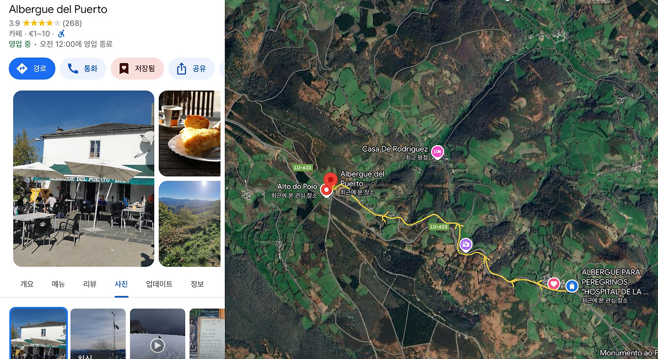 우리는 이야기꽃을 피우며 걷다 보니 순식간에 Alto do Poio에 도착했다. 언덕이 끝나는 지점에 도로가 나타났고, 그 길가에는 카페 겸 숙소 두 곳이 보였다. 우리는 그중 Albergue del Puerto에 들어가 아침을 먹기로 했다.