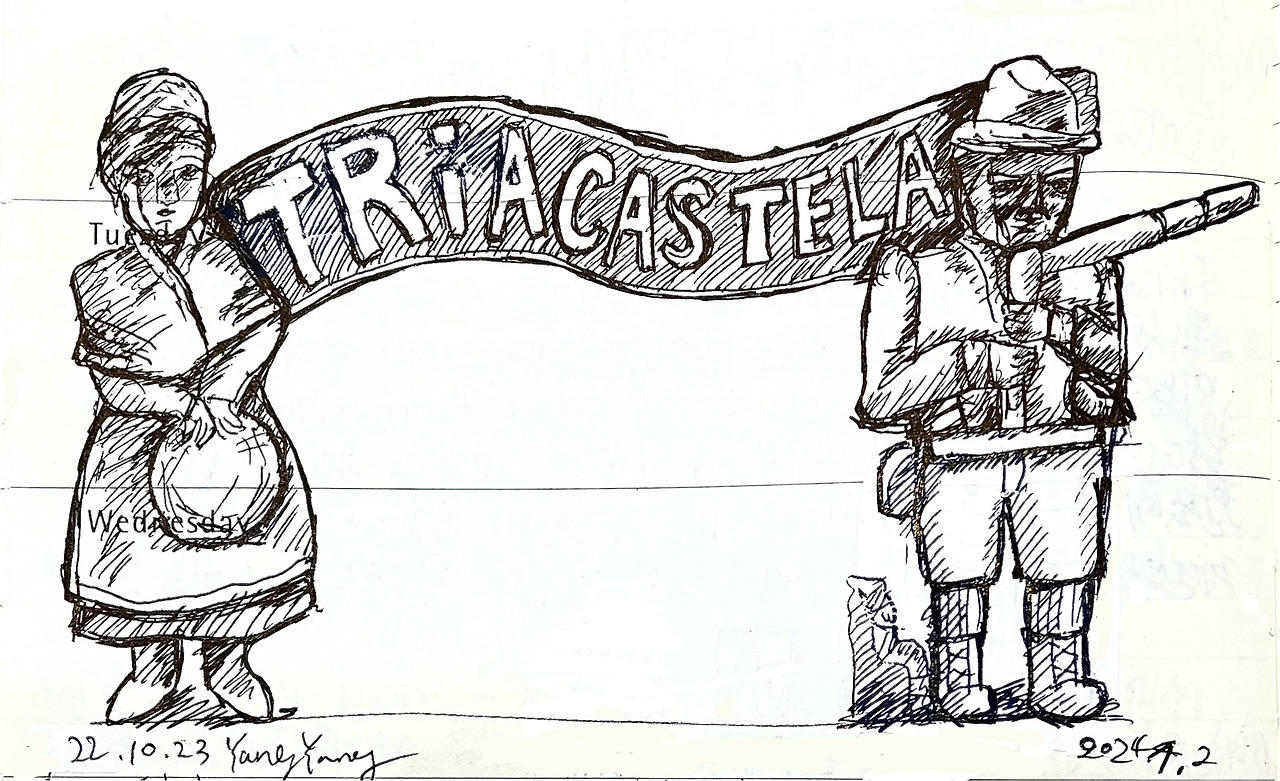 트리아카스텔라로 들어가는 다리 입구에서 나는 초반 길에서부터 알고 지내던 이안과 다시 마주쳤다. 그런데 아까 조난을 당했던 할머니처럼 얼굴이 검어져서 몹시 상태가 좋지 않아 보였다. 나는 반갑게 인사하고 무슨 상황인지 물어보니, 이안은 며칠 전 폰페라다 전에 급경사 산을 내려오면서 근육이 다쳤던 것 같다고 말했다.