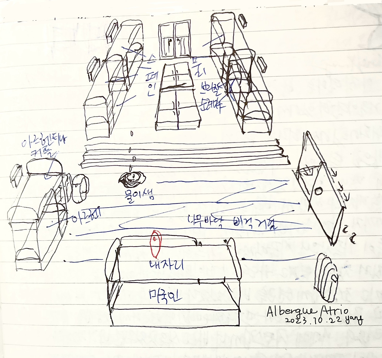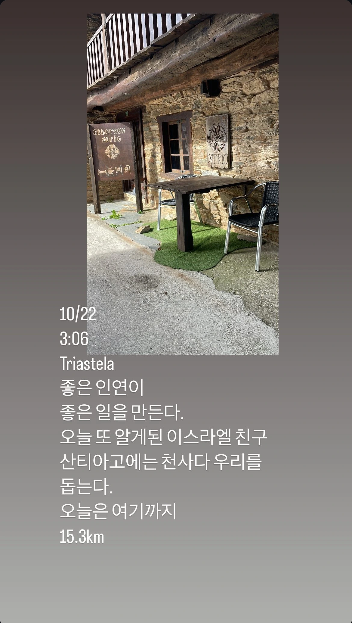 나는 트리아카스텔라 마을 입구에서 발을 무겁게 내딛으며 걸어 들어갔다. 내가 예약한 숙소는 Albergue Atrio였는데, 거의 마을 초입에 위치해 있어 이안과의 짧은 만남을 뒤로하고 숙소로 들어가며 괜스레 걱정이 됐다.