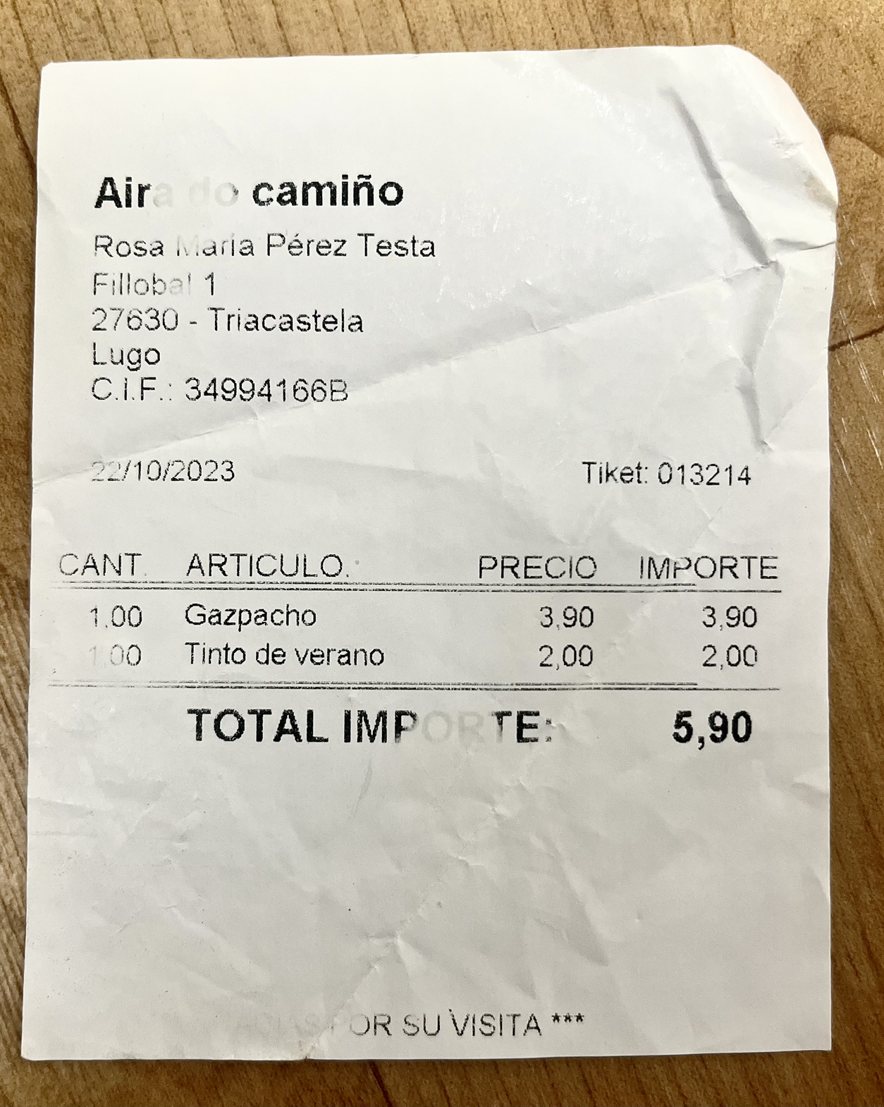 이 음식점은 한글로 시래기 국밥을 적어놓고 판매하고 있었다. 하지만 나는 아까 폰프리아에서 마신 오렌지주스 덕분에 아직 그렇게 배가 고프지 않았다. 그래서 가스파쵸와 빵, 그리고 띤또 데 베라노를 시켰다. 날이 쌀쌀했는데 내가 선택한 메뉴는 모두 시원한 여름 음식이라 그런지, 식사 후에 냉기가 느껴졌다. 개인적으로 갈리시아 수프를 보면서 한국의 시래기 감자탕과 비슷하다는 생각이 들었고, 아마 한국인들이 제보해서 밥과 함께 판매하게 된 게 아닐까 싶었다.