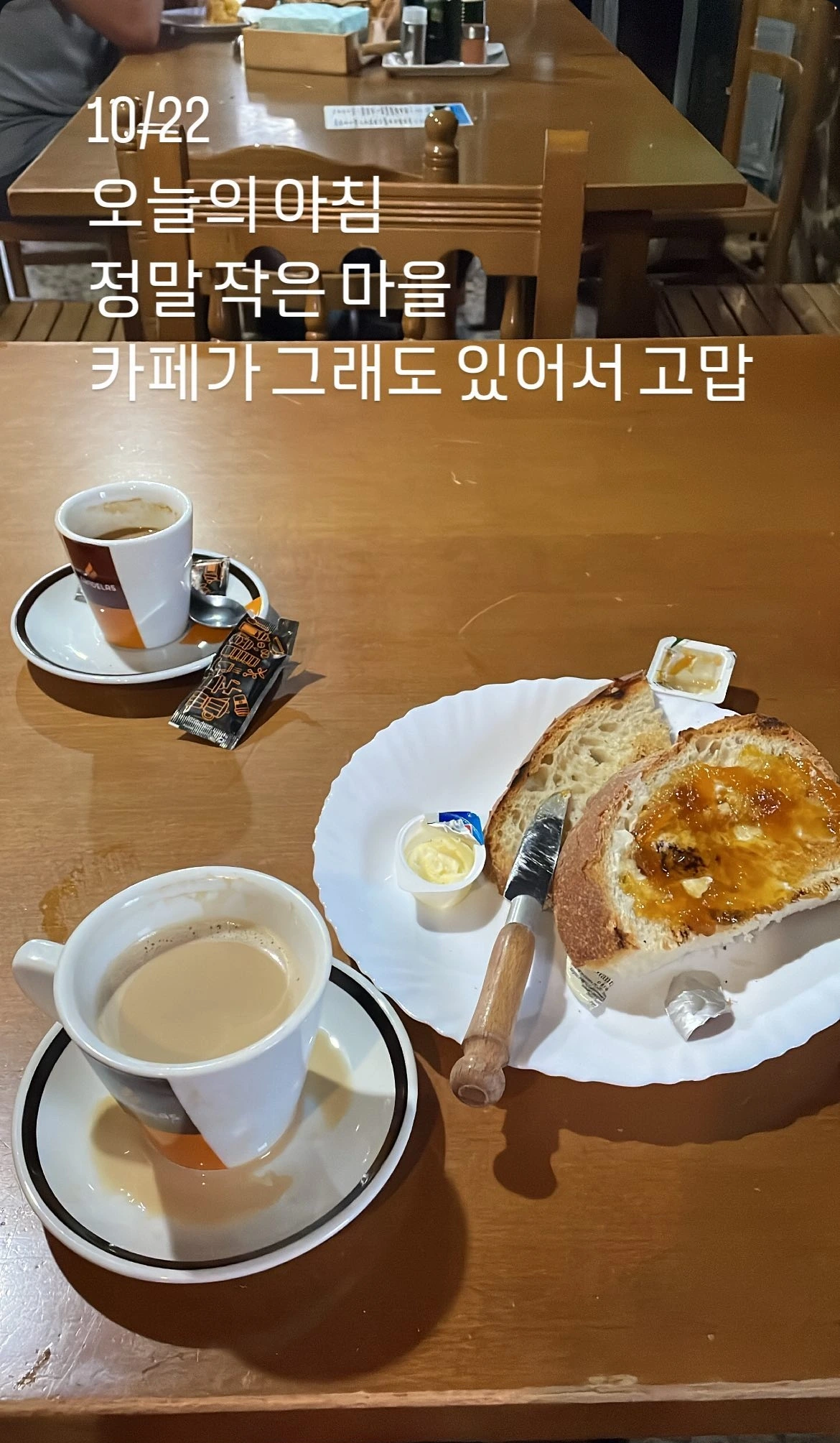 순례자들은 서늘한 아침 공기에 몸을 녹이려는 듯 저마다 또르띠야와 카페 콘 레체를 주문해 아침을 먹고 있다. 하지만 나는 수비리에서 식중독을 겪은 이후로 또르띠야를 멀리하고 있었다. 그래서 언제나처럼 익숙한 메뉴, 토스트와 잼을 주문했다.