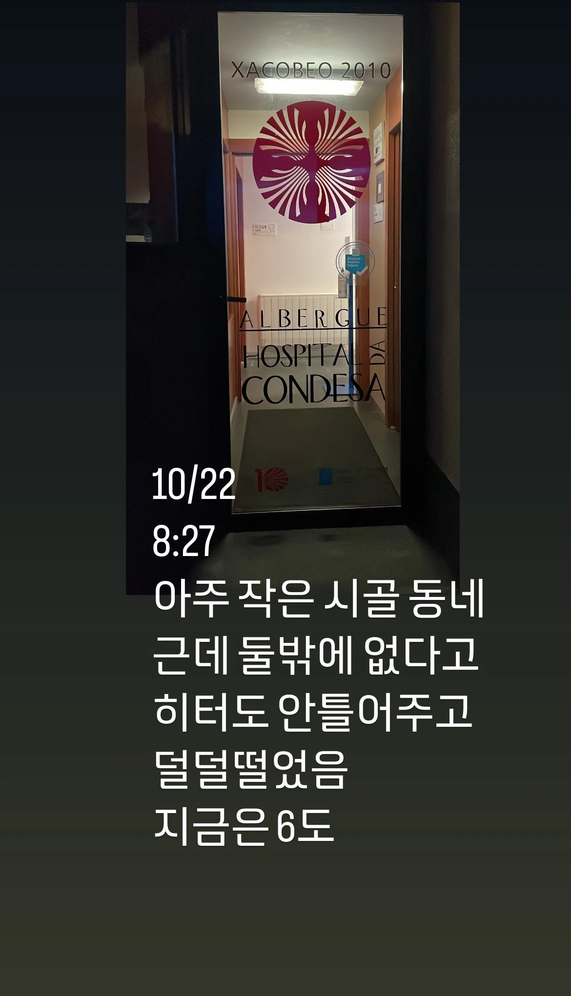 지배인의 안내에 따라 숙소에 짐을 풀고 0층 샤워실로 가서 샤워를 하니, 역시 이곳의 습한 기후와 추운 날씨 덕분에 드라이어기가 화장실에 배치되어 있었다. 덕분에 머리를 빨리 말릴 수 있었다. 빨래한 옷과 속옷을 들고 방으로 돌아오니, 어느새 입소한 룸메이트들로 가득 차 있었다. 안쪽 자리에 배치된 젊은 스페인 무리와 라바넬 델 카미노에서 만났던 브라질 순례자와 그 친구가 짐을 풀고 있었다.