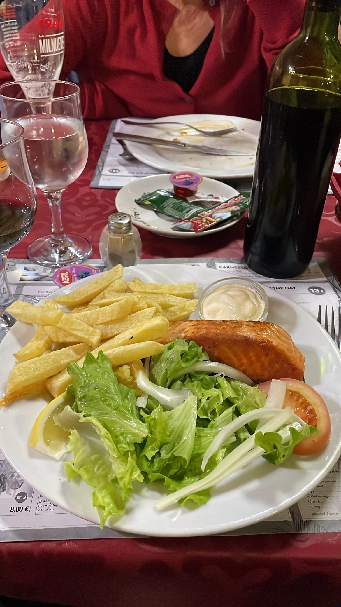 나는 곧바로 순례자 메뉴로 연어 구이, 감자칩, 샐러드, 그리고 잔 와인을 주문했더니 한 병의 와인이 나왔다. 디저트로는 지역 특산품인 쌀푸딩까지 완벽하게 아늑하고 기분 좋은 저녁 식사였다.