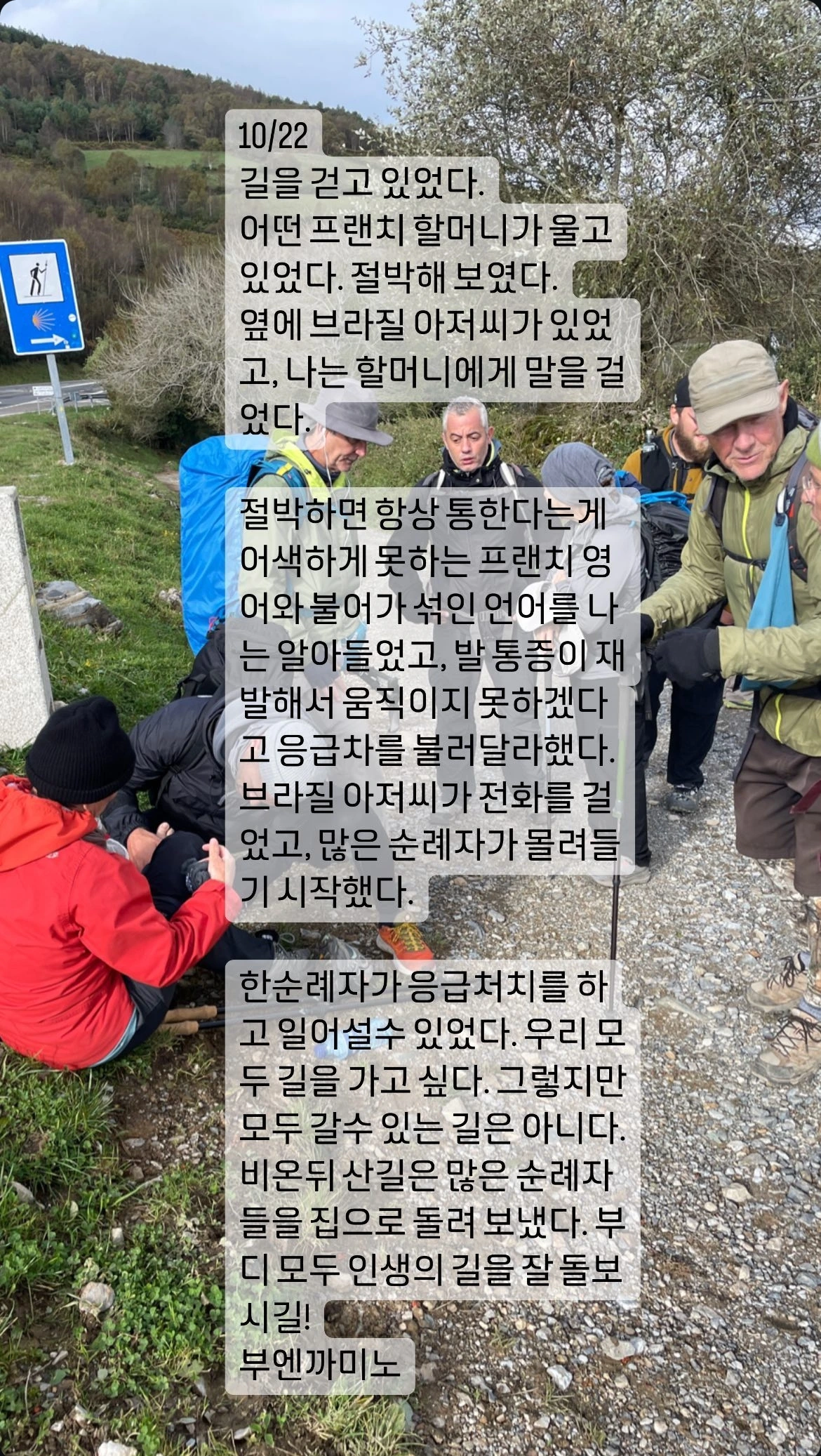 "내일 길을 포기하더라도 이렇게 가슴 따뜻하게 상처 입은 영혼을 보듬어주는 순례길에서 완주가 큰 의미가 없다는 것과, 마음먹었을 때 멈출 수 있는 용기도 필요하다는 교훈을 할머니를 통해 배웠다."