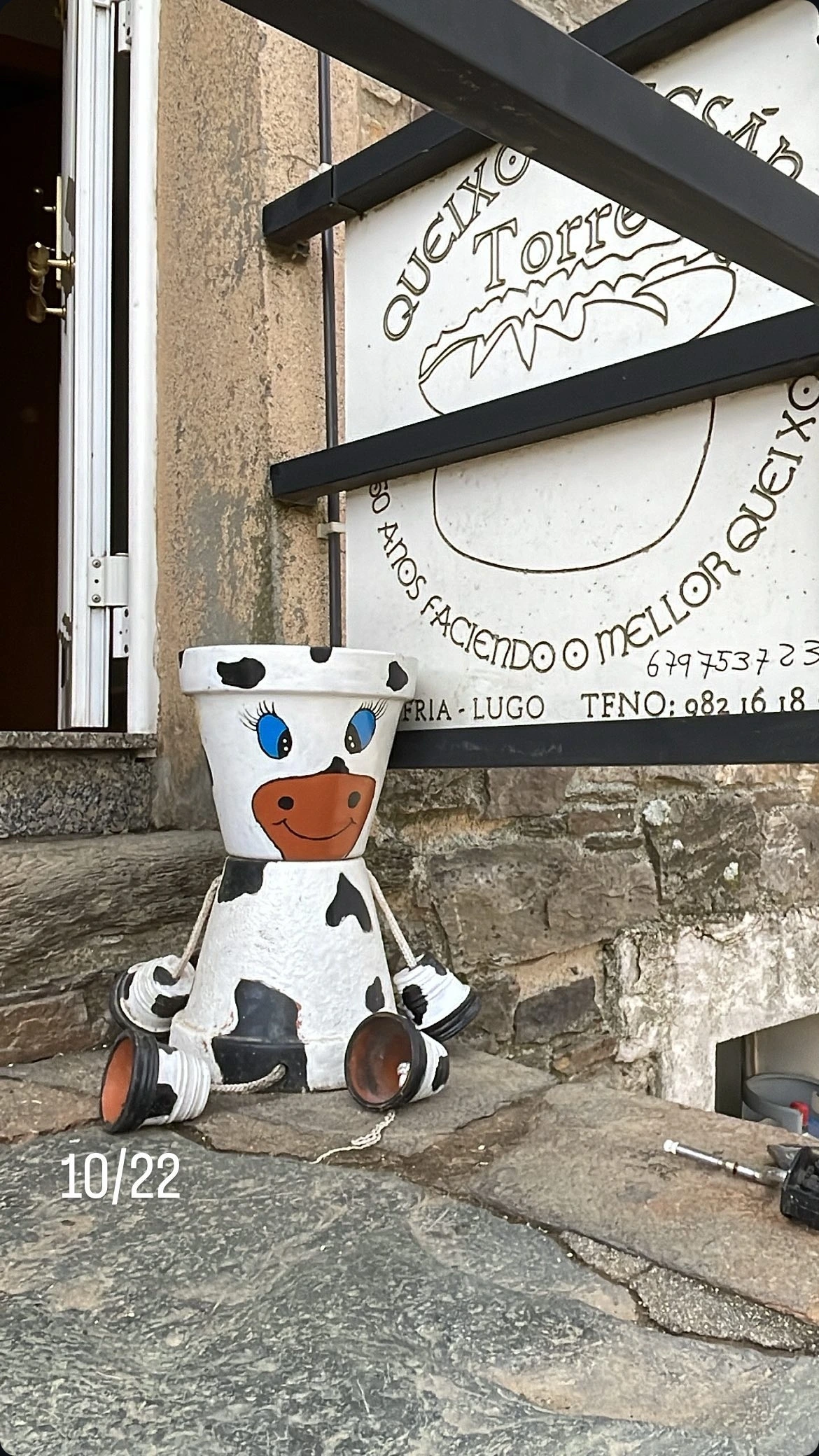 길을 걷다 보면 보이는 일반 가정집에는 벽에 화분을 걸어놓거나 신발과 화분을 위아래로 겹쳐서 만단 길상 오브제가 지나가는 순례자들의 눈을 즐겁게 했다. 젖소 모양의 길상이 집 입구에 앉아 집을 지키고 있었다. 오스피딸에서 폰프리아까지는 6km 정도밖에 되지 않기 때문에 마리아와의 동행이 곧 끝나가고 있었다.