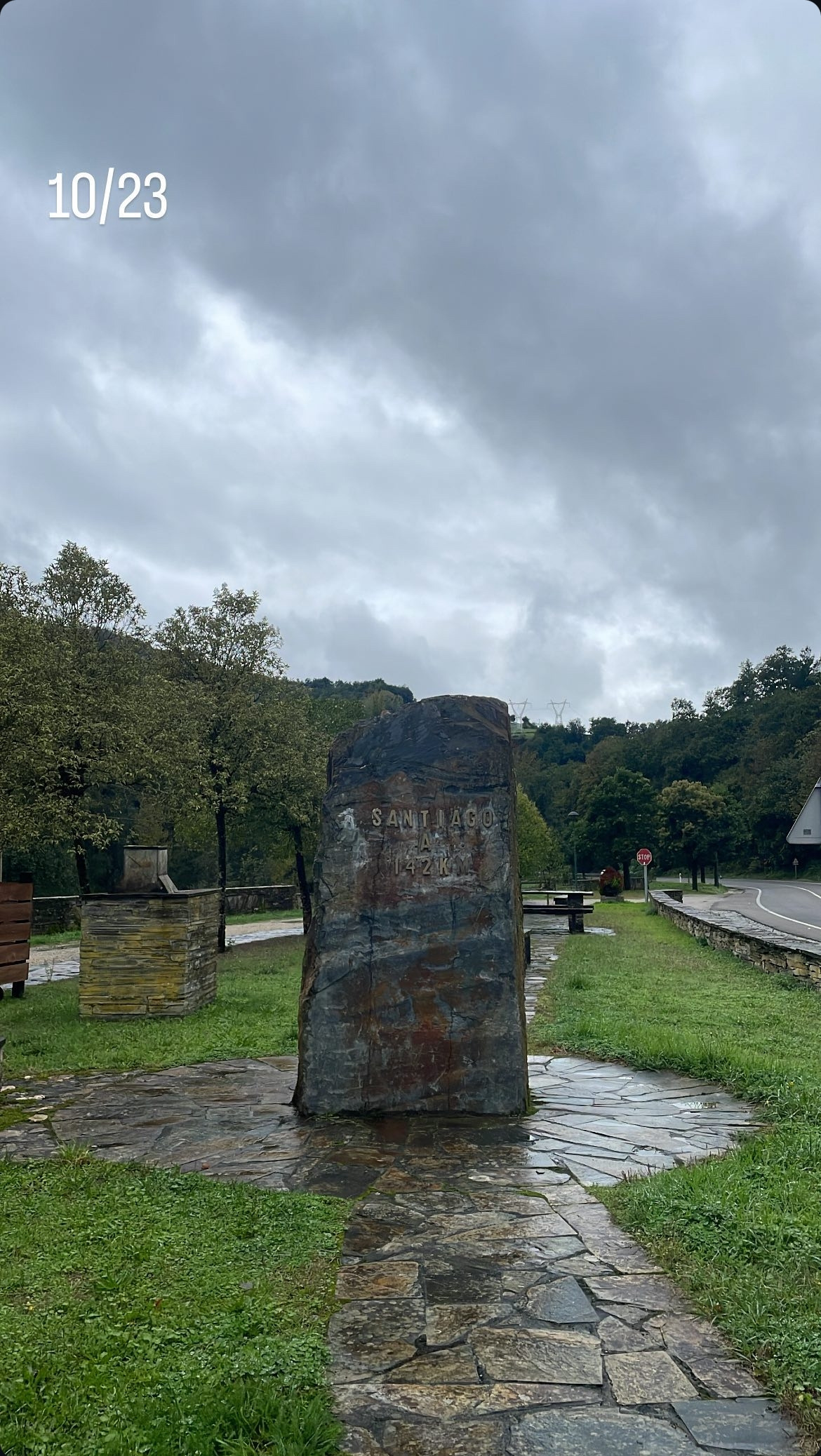 LU-633 도로를 강을 따라 850m를 걸어가다 보면 ÁREA DE DESCANSO가 나타난다. 돌로 만들어진 순례길 비석과 휴게실인데, 이 지역이 얼마나 돌이 많은지 보여주는 듯 의자도 비석도 모두 돌이었다.
